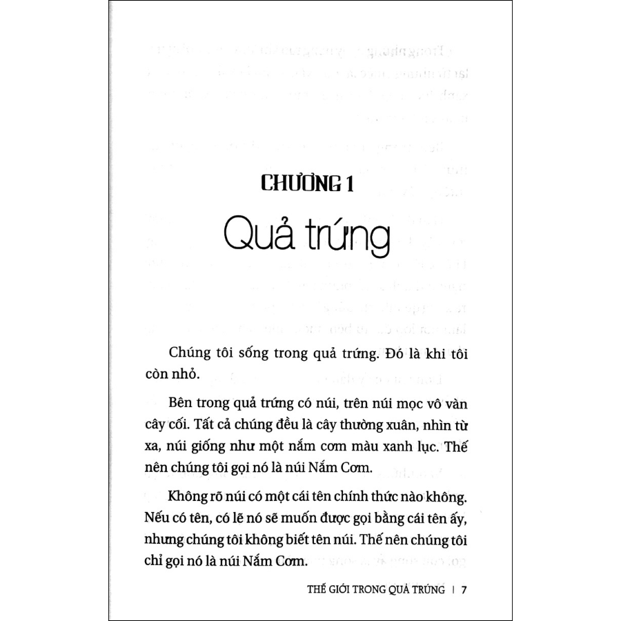 "THẾ GIỚI TRONG QUẢ TRỨNG" là một cuốn sách đầy cảm xúc, đưa bạn đọc nhỏ tuổi đến một thế giới tưởng tượng kỳ diệu và đầy suy ngẫm. Cuốn sách kể về một cậu bé sống trong một quả trứng khổng lồ, nơi có cả núi, sông, biển và những thị trấn nhỏ bé. Đến sinh nhật 13 tuổi, cậu bé phải đối mặt với một quyết định quan trọng: tiếp tục cuộc sống yên bình trong quả trứng hay bước ra thế giới bên ngoài.