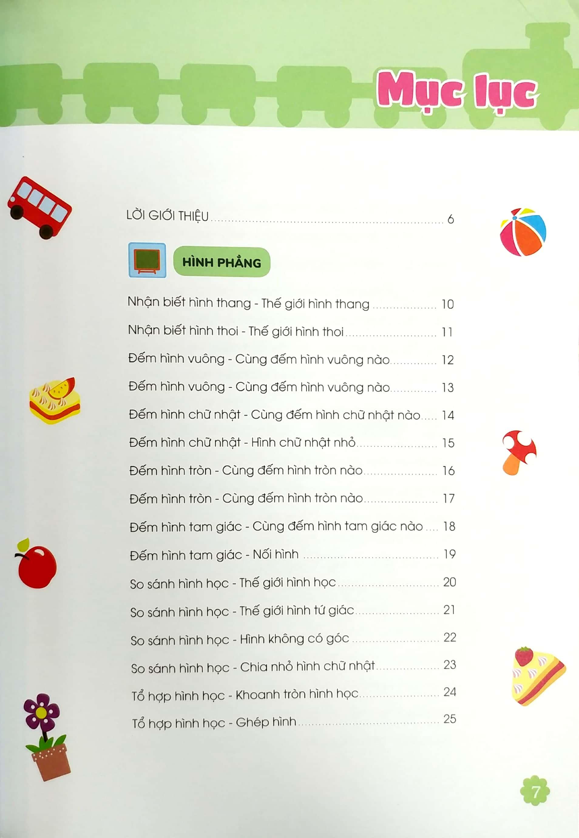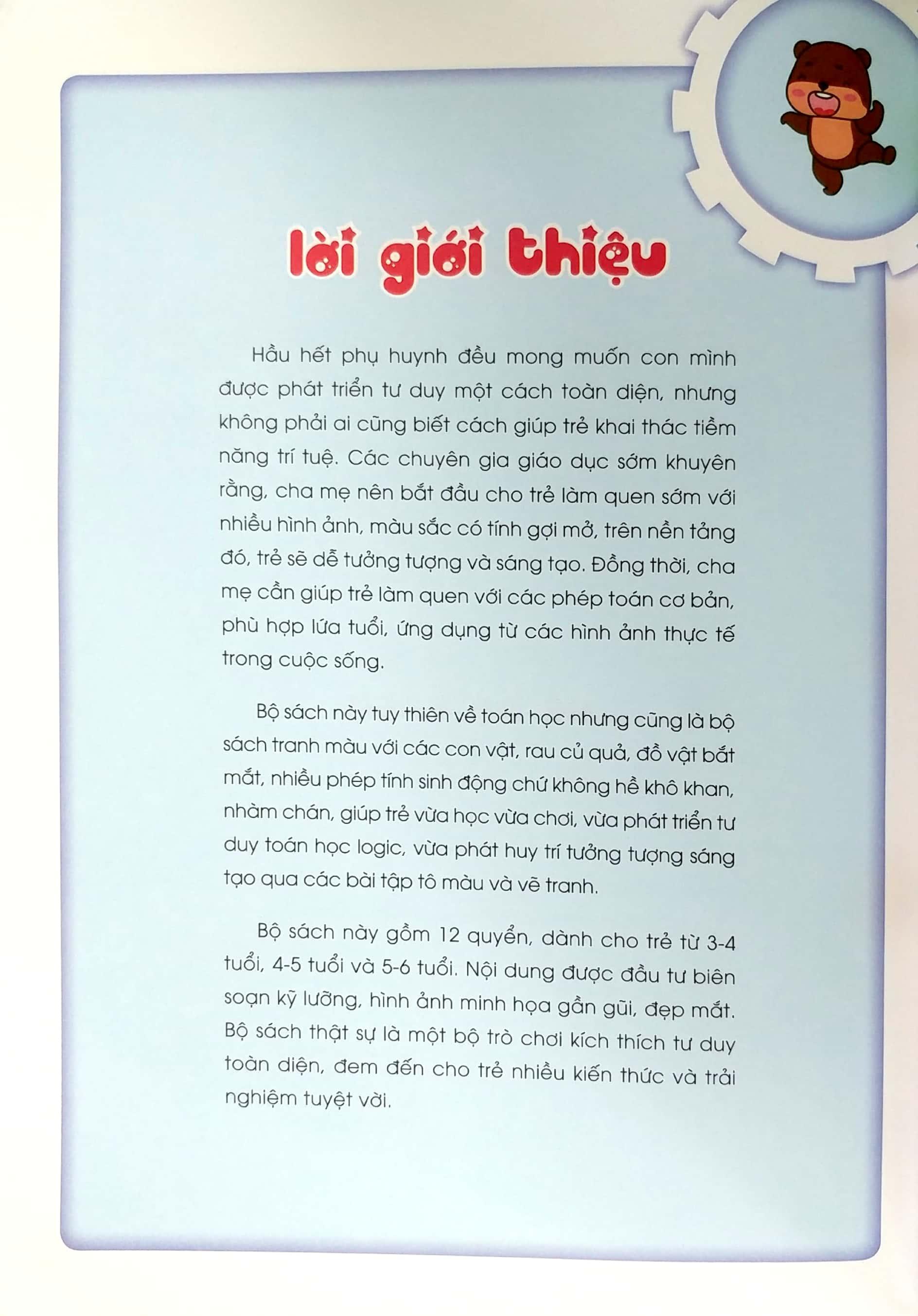 Bộ sách giúp trẻ biết so sánh, phân loại đồ vật, nhận biết các dạng hình học, không gian, thời gian, các con số và phép tính. Trẻ sẽ được gợi mở tiềm năng trí tuệ một cách tự nhiên nhất thông qua các bài tập với nhiều hình ảnh các con vật đáng yêu, trái cây giàu màu sắc, vật dụng quen thuộc hàng ngày, Các bậc phụ huynh sẽ không khỏi ngạc nhiên khi thấy các bé làm bài tập hoài mà không biết chán!Giá sản phẩm trên Tiki đã bao gồm thuế theo luật hiện hành. Bên cạnh đó, tuỳ vào loại sản phẩm, hình thức và địa chỉ giao hàng mà có thể phát sinh thêm chi phí khác như phí vận chuyển, phụ phí hàng cồng kềnh, thuế nhập khẩu (đối với đơn hàng giao từ nước ngoài có giá trị trên 1 triệu đồng).....
