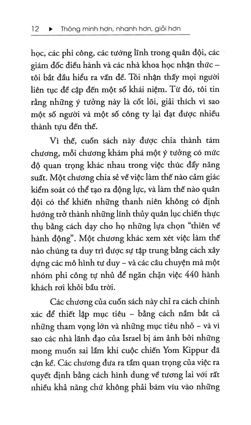 Thông minh hơn, nhanh hơn, giỏi hơn là kết quả nhiên cứu của Charles Duhigg về cơ chế hoạt động của năng suất và nỗ lực để tìm hiểu lý do vì sao một số cá nhân và doanh nghiệp lại đạt được năng suất cao hơn những cá nhân và doanh nghiệp khác rất nhiều. Tác giả chia cuốn sách ra thành tám chương, mỗi chương khám phá một ý tưởng có ảnh hưởng khác nhau đến việc thúc đẩy năng suất.