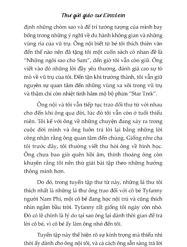 - Cuốn sách là một bộ sưu tập những lá thư chân thành, dí dỏm mà Albert Einstein đã viết cho các bạn nhỏ từ khắp nơi trên thế giới. Qua những câu hỏi ngây thơ, hồn nhiên của trẻ em, chúng ta cùng Einstein khám phá những vấn đề khoa học lớn lao như vũ trụ, thời gian, ánh sáng... Bên cạnh đó, cuốn sách còn cung cấp những thông tin thú vị về cuộc đời và sự nghiệp của nhà bác học thiên tài này.