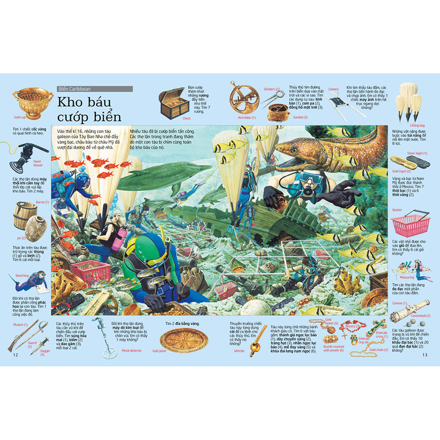 Từ bạch tuộc khổng lồ và cá mập trắng đến những thợ lặn biển sâu và kho báu dưới biển, trong các trang của cuốn sách tranh tuyệt đẹp này có nhiều thứ để em tìm kiếm. Thử tài tìm kiếm – Biển khơi chứa đựng vô vàn thông tin thú vị về thế giới trong lòng biển, từ rạn san hô kì diệu đến đáy đại dương sâu thẳm.