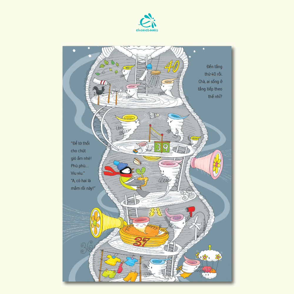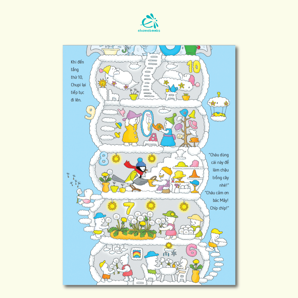 Mỗi tầng của tòa nhà lại mang đến cho Chupi những khám phá bất ngờ và những câu chuyện kỳ diệu. Từ tầng mây lơ lửng, những cánh đồng hoa tuyết trắng xóa cho đến những ngôi nhà của các loài chim, tất cả đều hiện lên sinh động qua từng trang sách.
