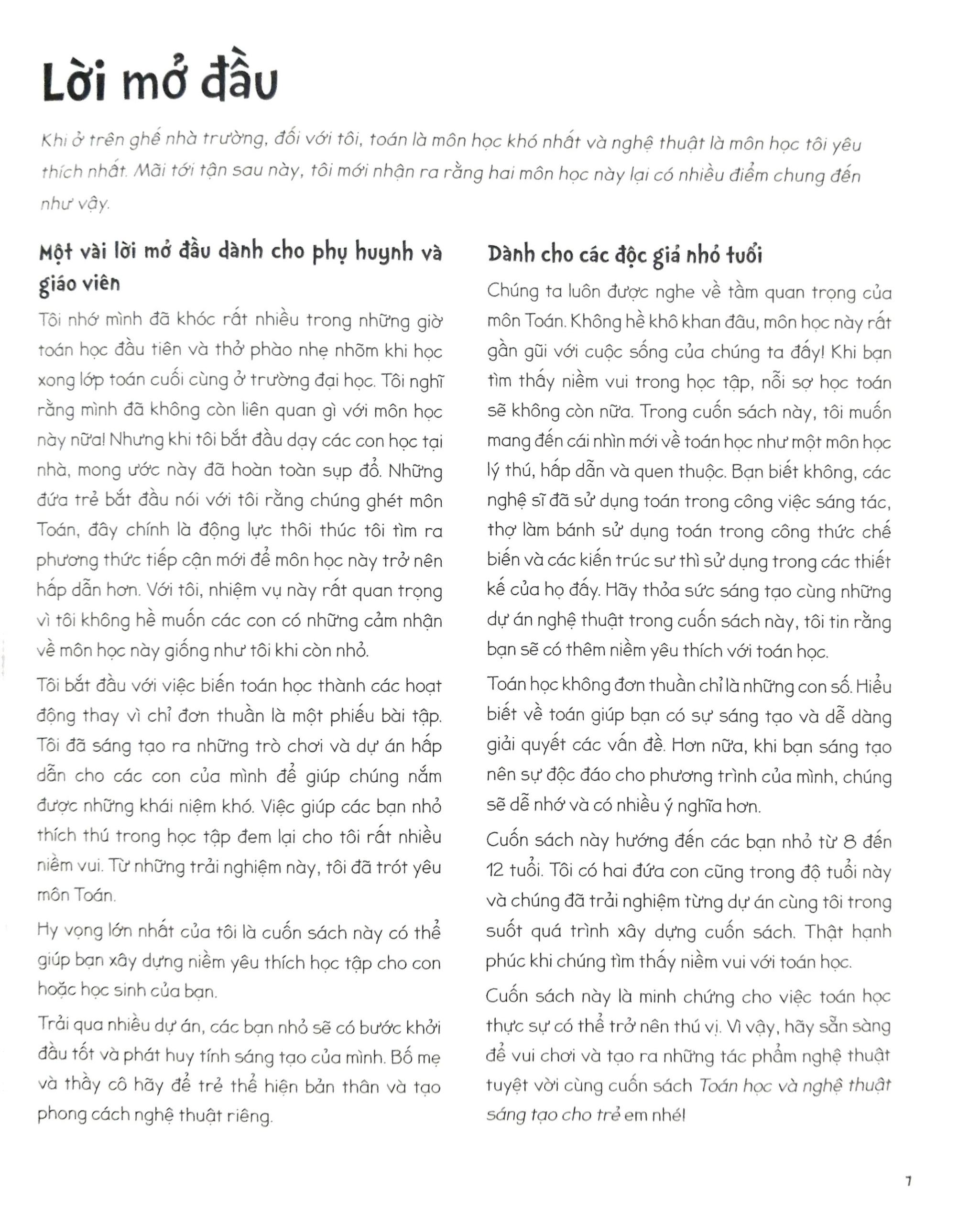 Nhiều hơn là một cuốn sách, Math Art - Toán học và nghệ thuật sáng tạo cho trẻ em mong muốn mang đến một không gian trải nghiệm thực thụ và những kiến thức bổ ích, để mỗi phụ huynh đều có thể cùng học và chơi với con mình thông qua những hoạt động sáng tạo và thực tế này!