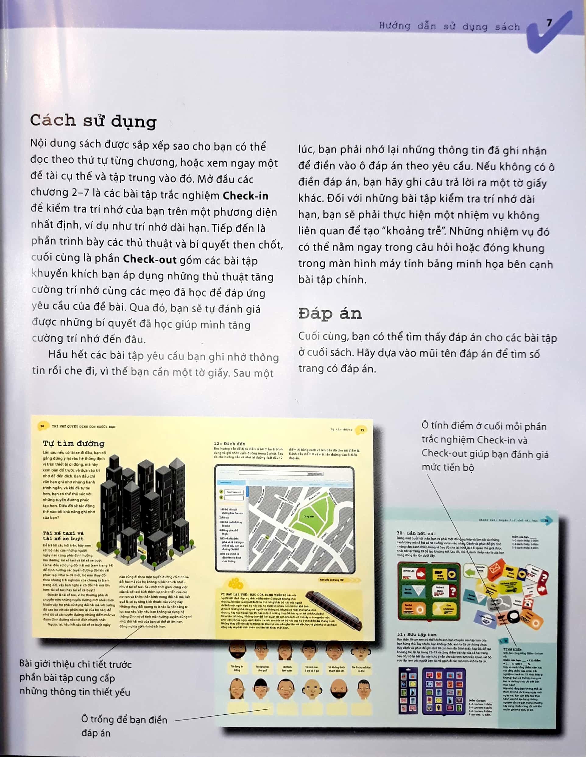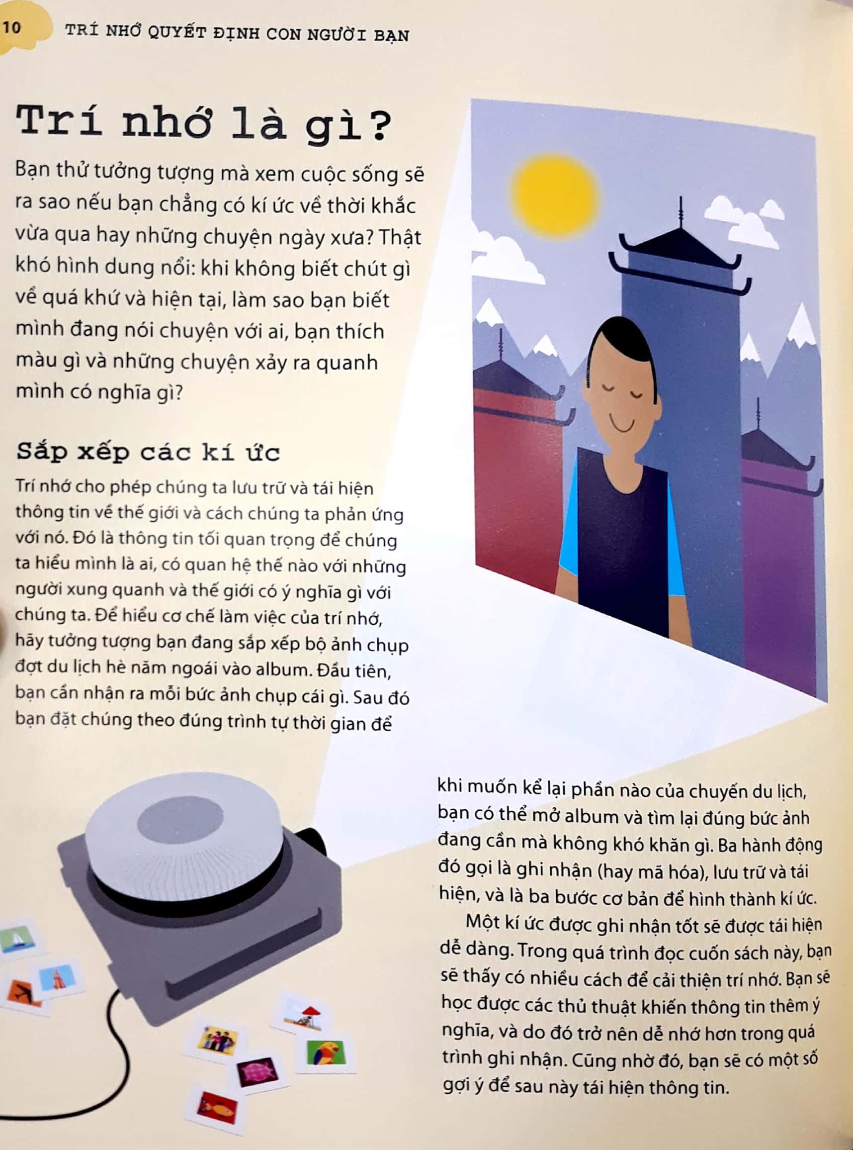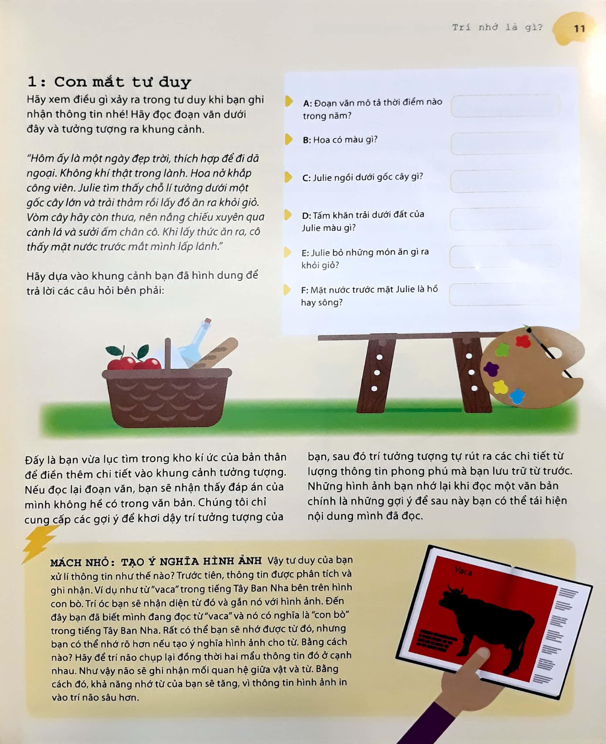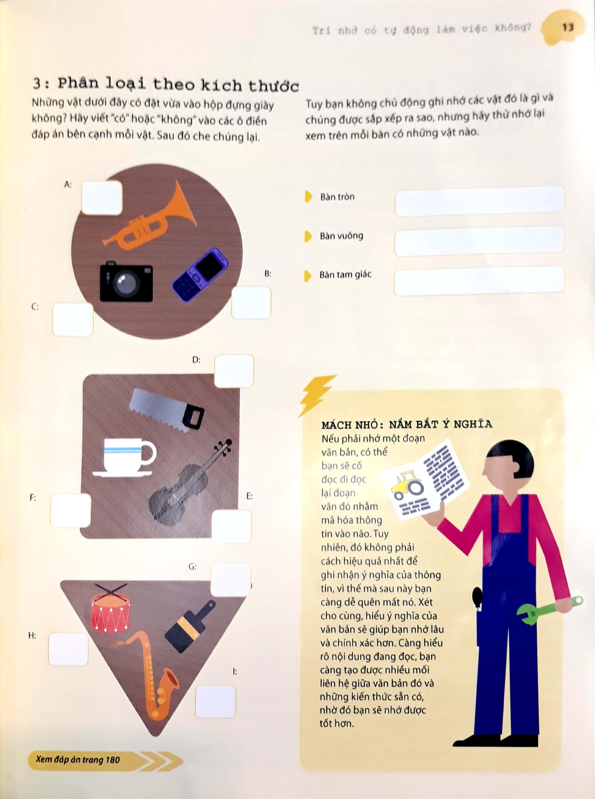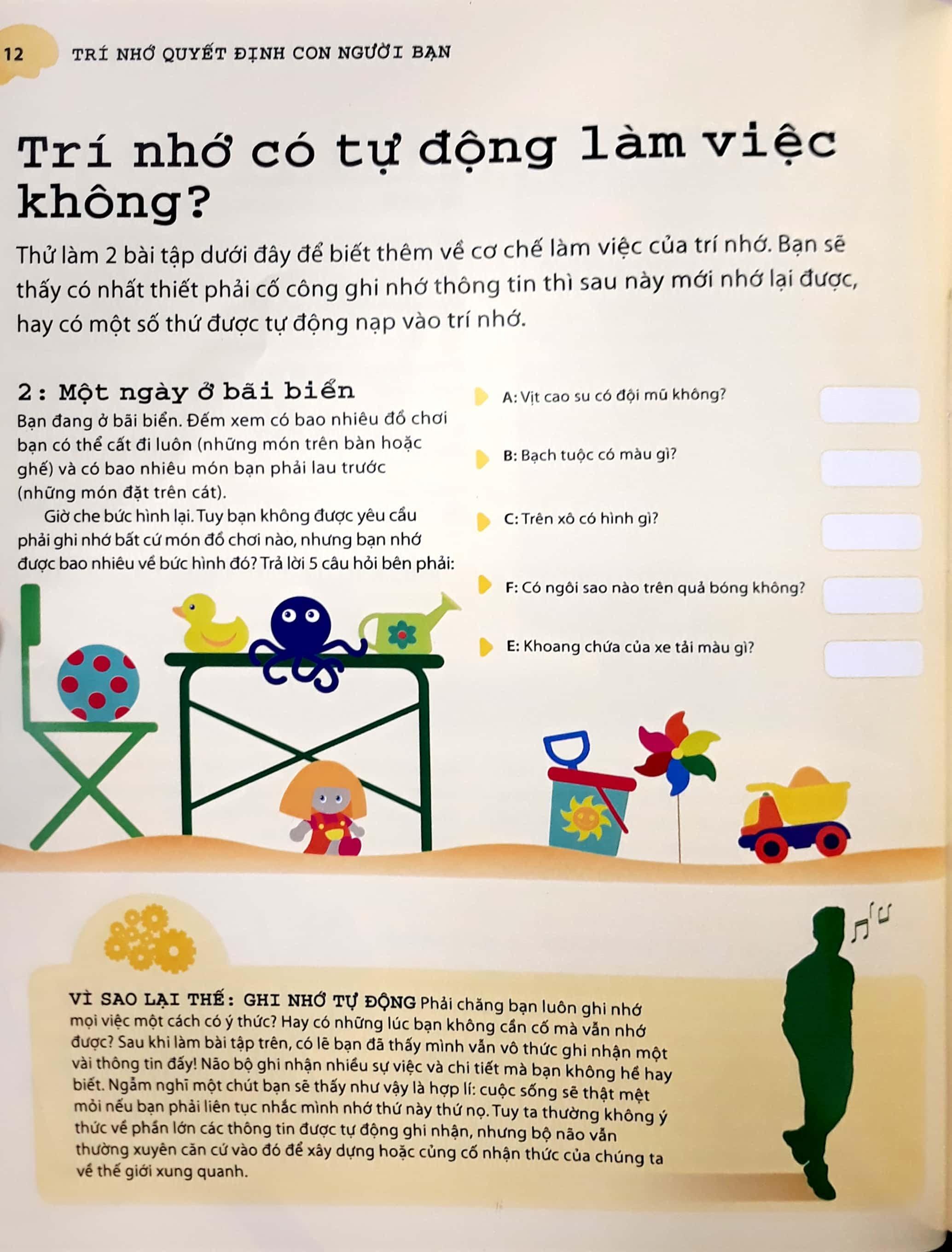 Sách này vô cùng hay và hữu dụng cho các bạn cần khắc phục trí nhớ của mình trở nên tốt hơn! Vì sách này có nhiều hình ảnh sôi động, nhiều màu sắc bắt mắt, ngôn ngữ hay, dễ hiểu và có các bài tập kiểm tra não cực kì tốt luôn, còn có đáp án nữa nhe. Để rèn luyện não của bản thân mỗi ngày, theo mình nghĩ cuốn sách này rất hữu ích cho tất cả mọi người luôn đấy!