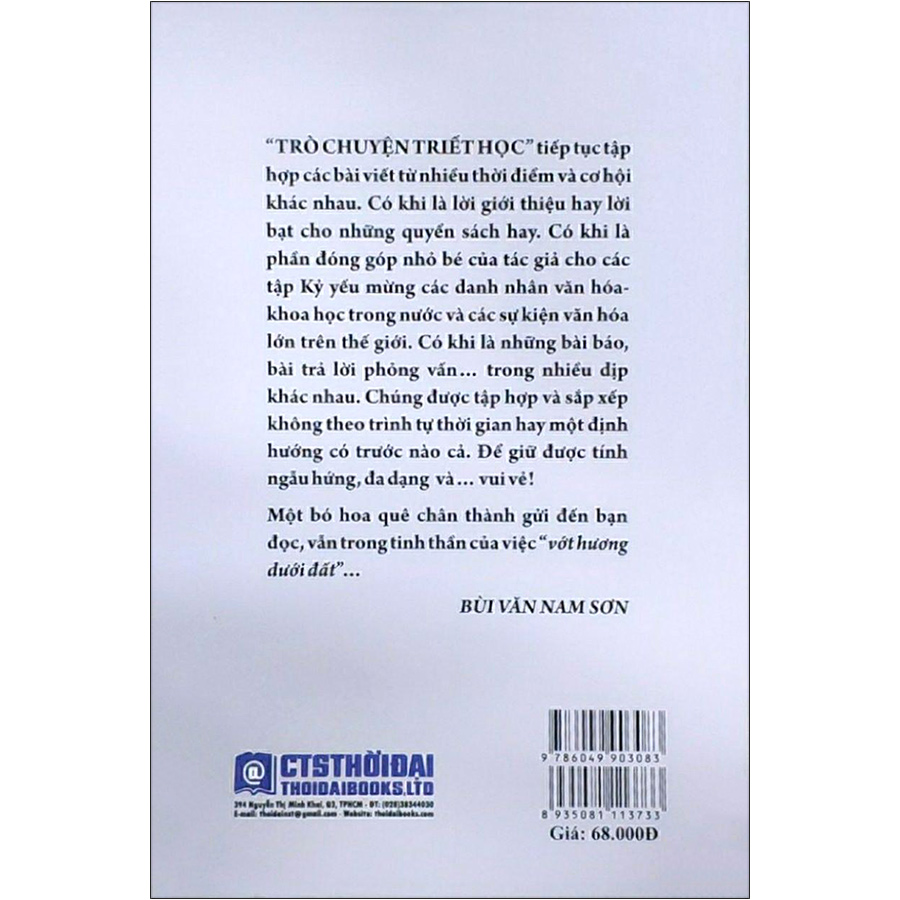 Triết học là một môn học không khó nhưng để nói chuyện về triết học cho mọi người nghe, mọi người cùng hiểu thì không phải dễ. Nhà nghiên cứu Bùi Văn Nam Sơn đã làm được điều ở vế thứ hai thông qua cuốn sách quý này. “Đây không phải là cuốn sách nhập môn triết học và cũng không hẳn là cuốn sách về lịch sử triết học, tuy nhiên nó có đủ các yếu tố của 2 loại sách đó.” – Huỳnh Như Phương