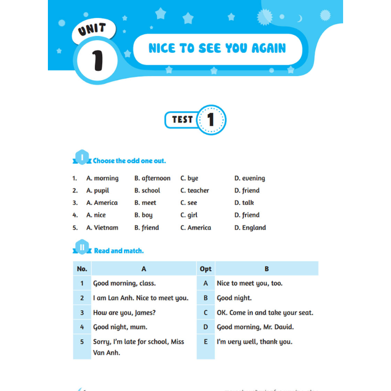 Mỗi Unit gồm hai bài kiểm tra. Bài tập được biên soạn đa dạng, phong phú, bám sát chương trình và sách giáo khoa, trình bày khoa học, dễ hiểu. Kết hợp với nội dung trong sách là link tải đĩa CD (đính kèm trên bìa sách) phát âm chuẩn tiếng Anh của người bản ngữ. Các em có thể sử dụng điện thoại smartphone để quét mã QR và tải các bài học một cách nhanh chóng và thuận tiện.