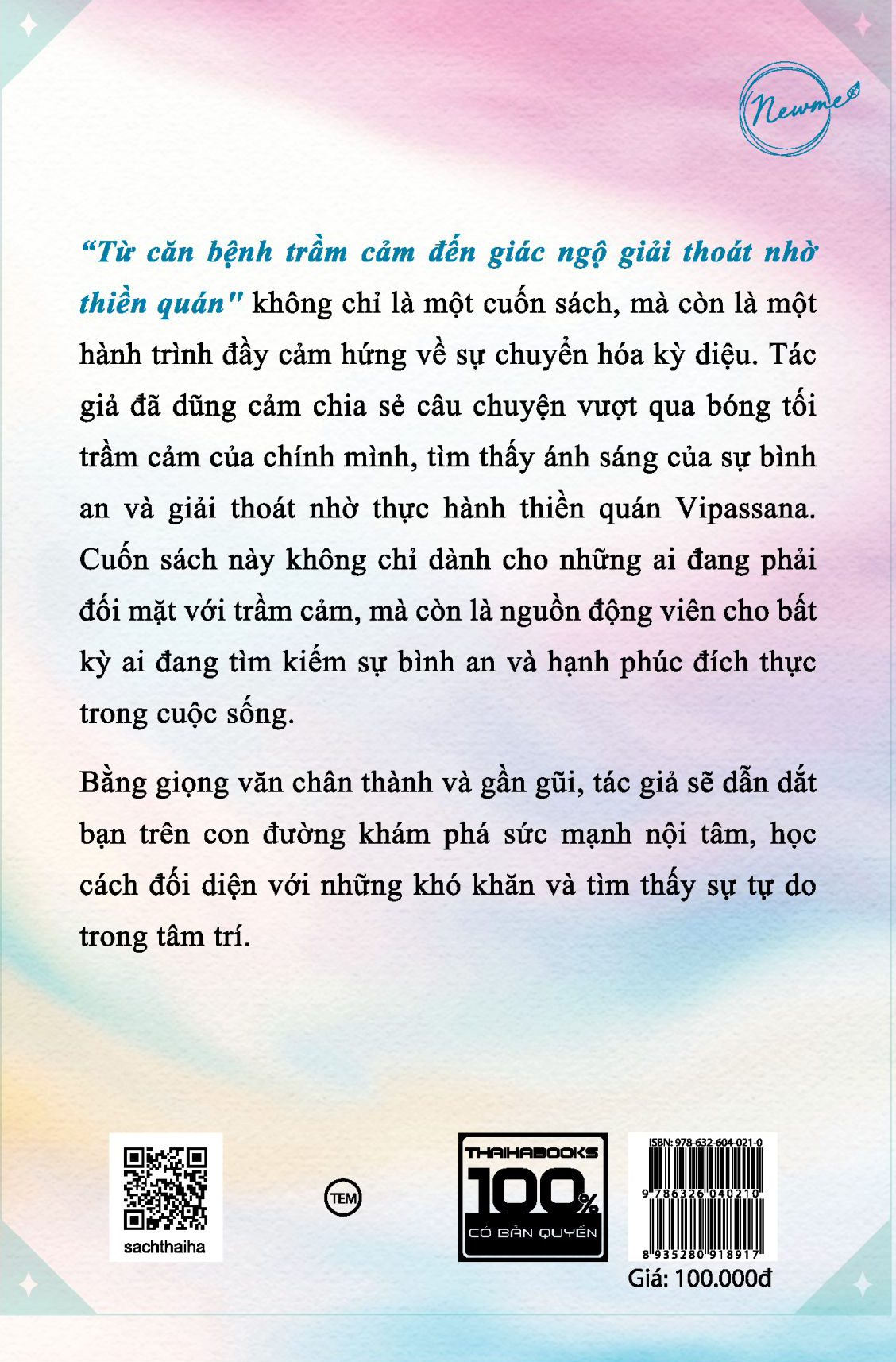 Những điều tốt đẹp thường không dễ gì có được. Không có con đường nào phù hợp với tất cả mọi người. Để thoát khỏi bờ mê, về đến bến giác, cần có rất nhiều nhân duyên, nhiều cố gắng của bản thân mỗi người, cần nghị lực, ý chí, khát vọng sống mạnh mẽ.“Từ căn bệnh trầm cảm đến giác ngộ giải thoát nhờ thiền quán" không chỉ là một cuốn sách, mà còn là một hành trình đầy cảm hứng về sự chuyển hóa kỳ diệu. Tác giả đã dũng cảm chia sẻ câu chuyện vượt qua bóng tối trầm cảm của chính mình, tìm thấy ánh sáng của sự bình an và giải thoát nhờ thực hành thiền quán Vipassana.