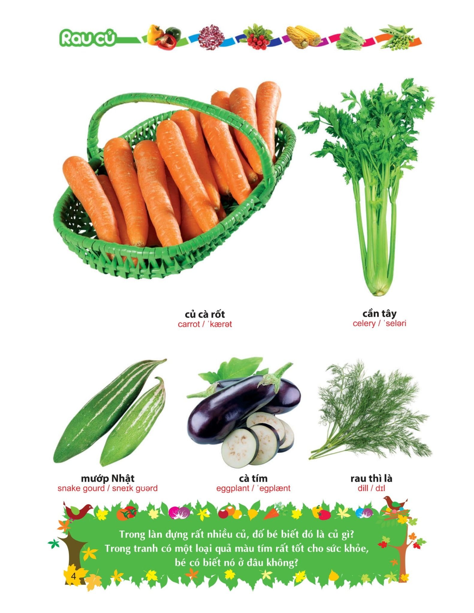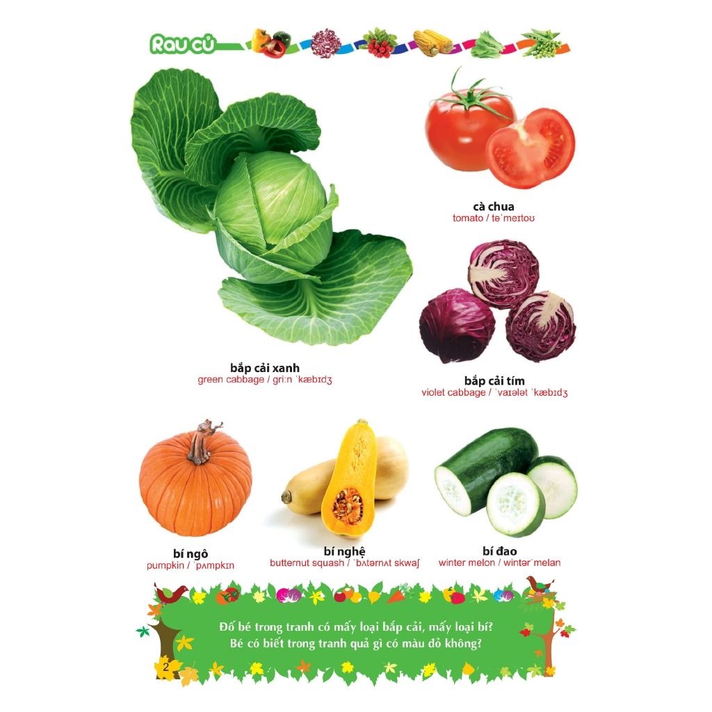 Cuốn sách với nhiều hình ảnh sinh động về các loại rau, củ, quả, hoa khác nhau giúp bé phát triển khả năng nhận biết. Cuốn sách còn là bộ sưu tập với nhiều hình ảnh gần gũi quen thuộc giúp bé trở nên thích thú. Bên cạnh đó hình thức song ngữ giúp bé gia tăng vốn từ vựng cả về Tiếng Việt lẫnn Tiếng Anh.