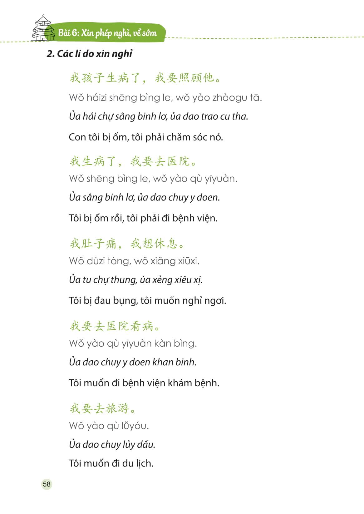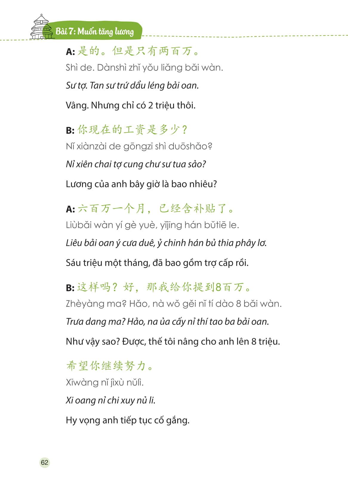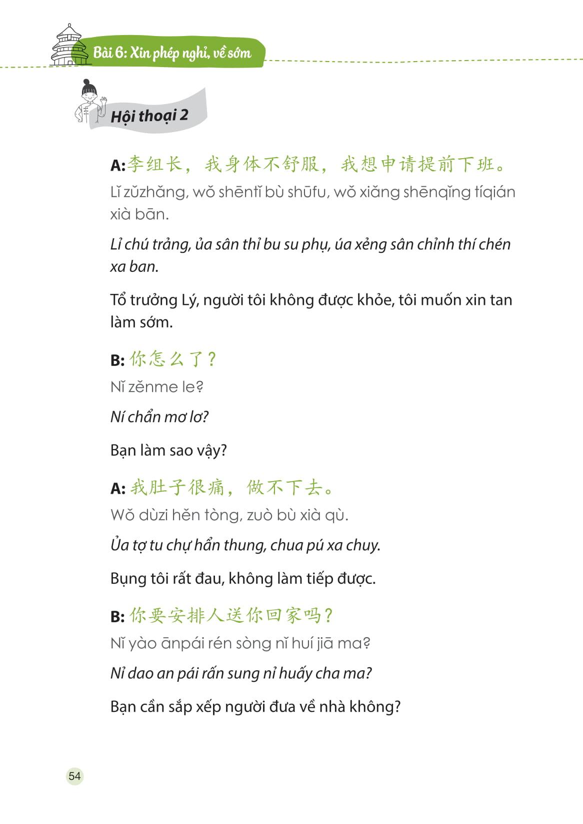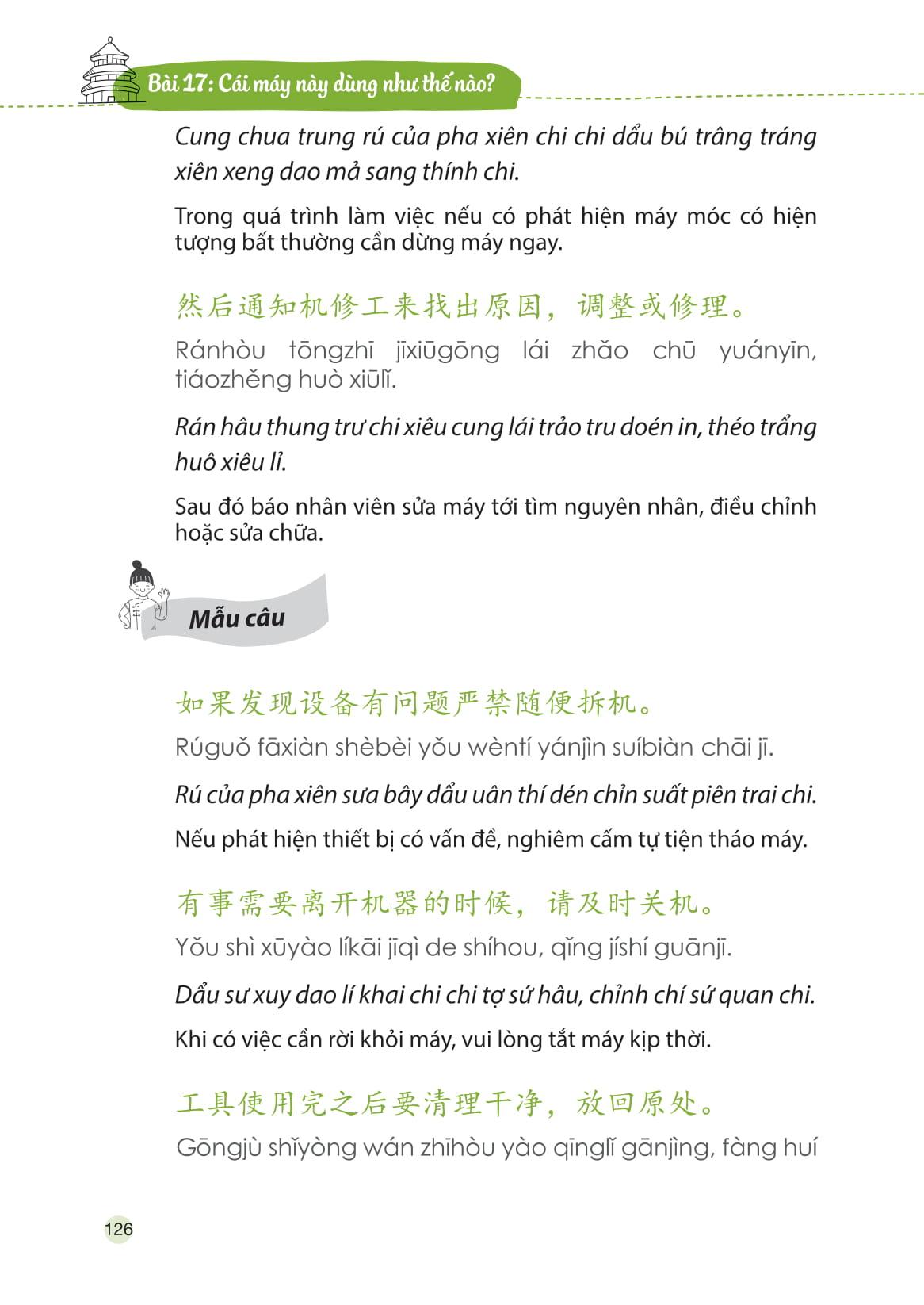 Ngoài việc cung cấp những mẫu câu giao tiếp hàng ngày (bao gồm phần chữ Hán, phiên âm chuẩn quốc tế, phần âm mô phỏng bằng tiếng Việt - âm bồi, phần dịch nghĩa), cuốn sách còn đưa ra rất nhiều công thức ngắn gọn với giải thích đơn giản, dễ hiểu, cùng hệ thống từ mới theo chuyên ngành giúp người học có thể vận dụng kiến thức một cách linh hoạt trong công việc và cuộc sống.