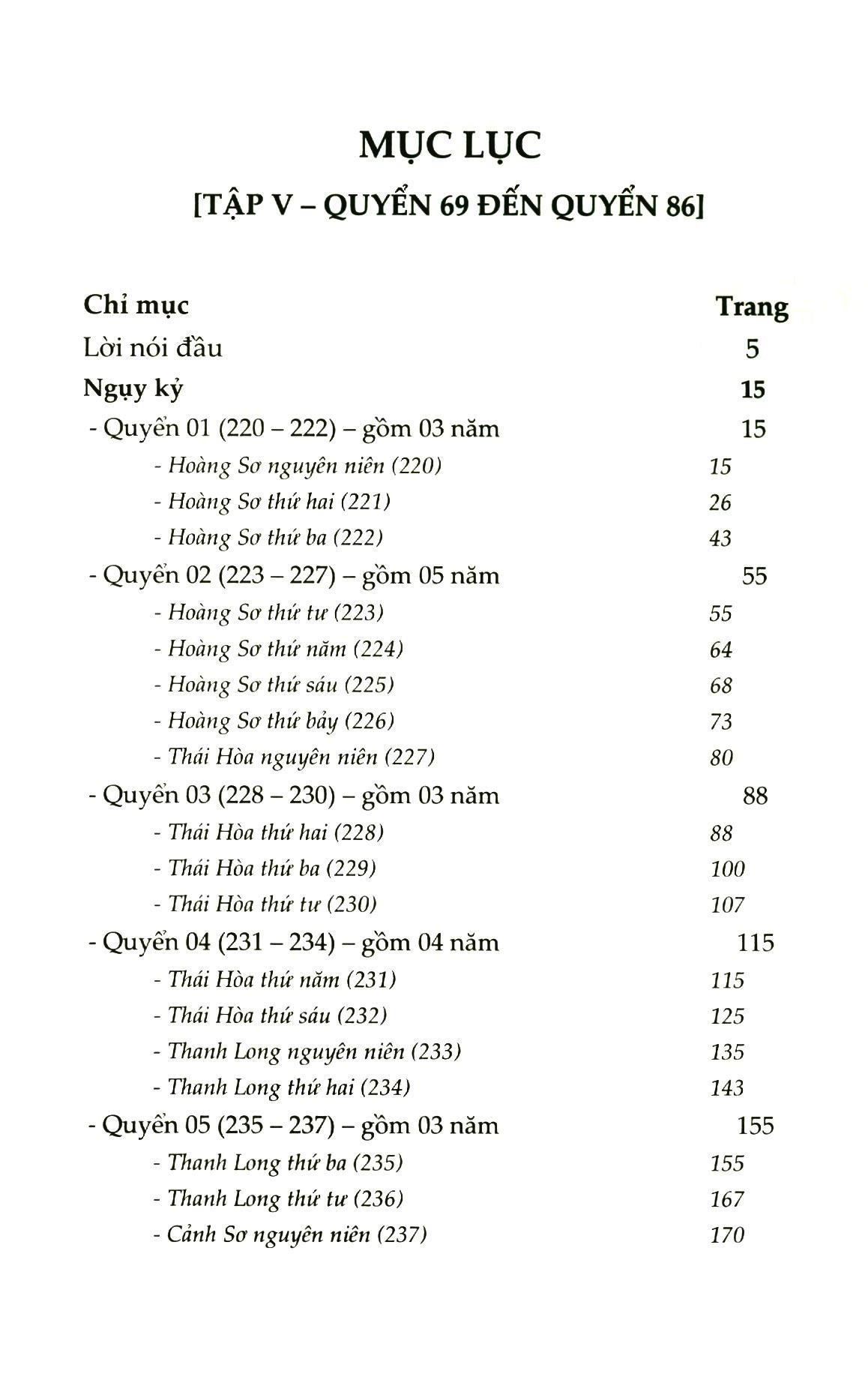 Sau sự thành công của bốn tập trước, Nhà xuất bản Văn học và Nhà sách Tri thức trẻ tiếp tục giới thiệu Tư Trị Thông Giám tập 5, tập 6 đến bạn đọc. Ở Tư Trị Thông Giám tập 5 và 6 lần này ghi chép lịch sử, những biến động chính trị, xã hội Trung Quốc giai đoạn nhà Ngụy và nhà Tấn (hai cuốn tập hợp Ngụy kỷ và Tấn kỷ), kết thúc giai đoạn Hán kỷ trước đó. Cũng chính vì lẽ đó, nhóm dịch giả Cổ Thư Lâu và Nhà sách Tri thức trẻ quyết định thay đổi màu bìa sách bản đặc biệt sang màu nâu để đánh dấu thời đại mới. Tư Trị Thông Giám là một bộ sách lịch sử đồ sộ, quý giá không thể thiếu trong tủ sách của những người nghiên cứu và yêu thích lịch sử và chính trị, đặc biệt là lịch sử - chính trị Trung Hoa.