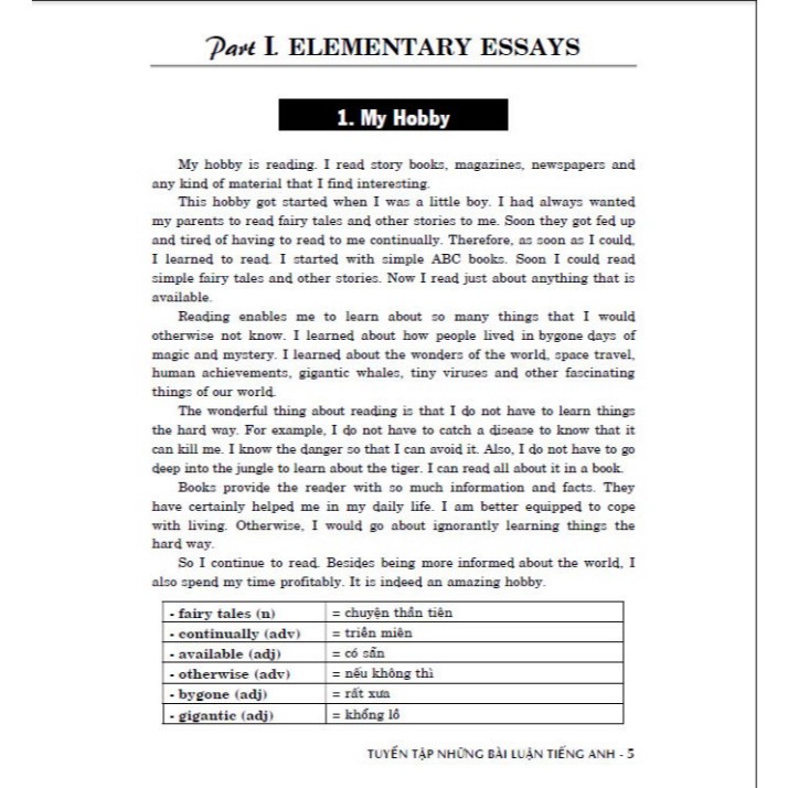 Cuốn Tuyển Tập Những Bài Luận Tiếng Anh tập hợp một số bài luận Tiếng Anh về các chủ đề gần gũi trong cuộc sống hàng ngày. Các bài luận này giúp rèn luyện cho các em học sinh kỹ năng viết tiếng Anh đồng thời ôn tập cho kỳ thi THPT Quốc gia.