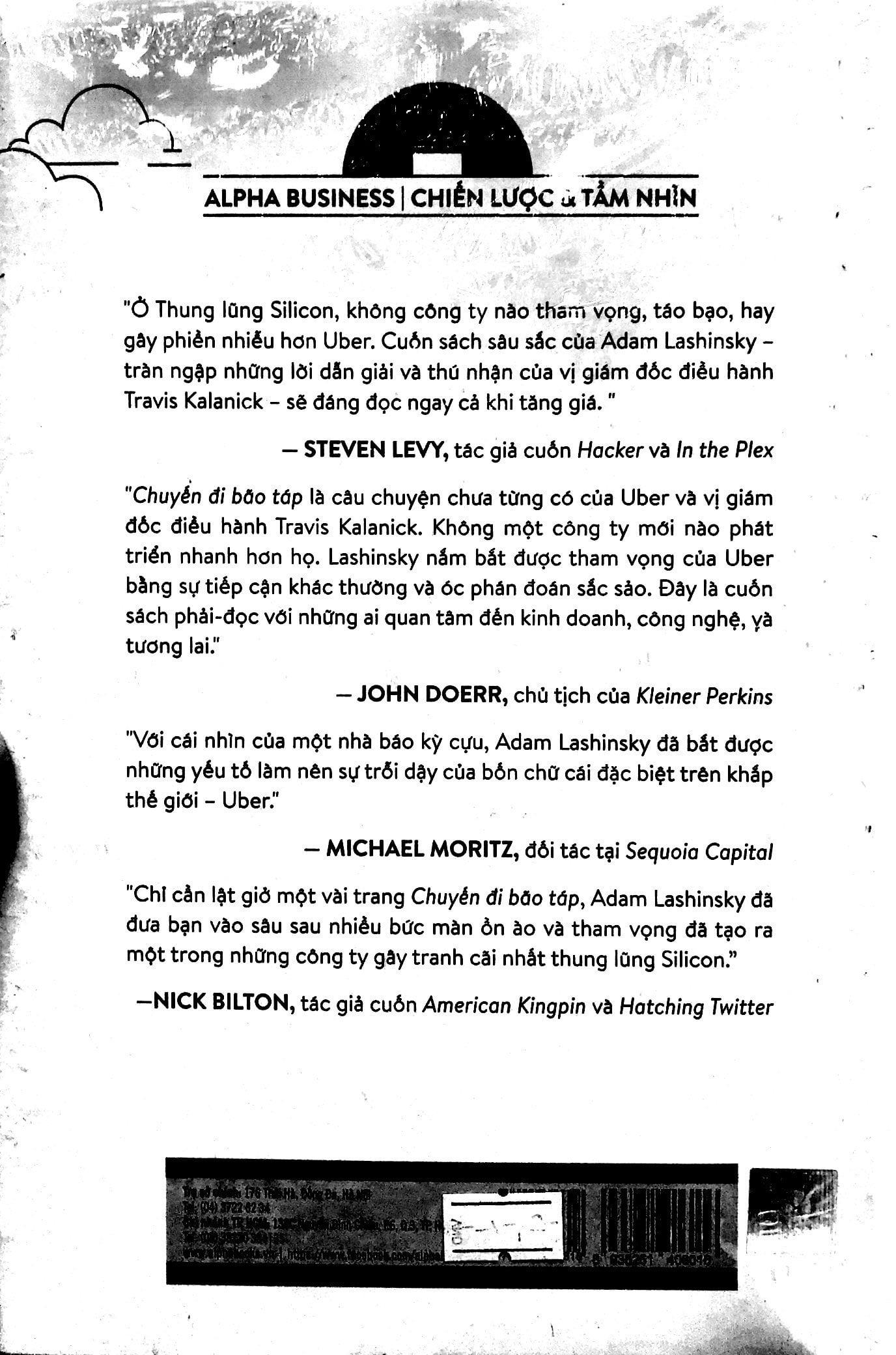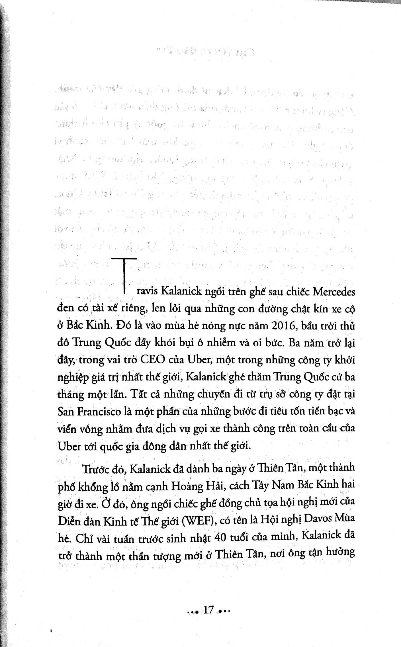 Uber là một trong những doanh nghiệp thú vị và gây nhiều tranh cãi nhất thế giới, vì ý tưởng đi chung xe thông minh, tốc độ tăng trưởng nhanh chóng và cả những cáo buộc nặng nề trước quyết tâm theo đuổi thành công bằng mọi giá của CEO Travis Kalanick. Bất chấp tầm quan trọng của công ty này với nền kinh tế và cuộc cách mạng trong ngành vận tải, cũng như trận chiến giành quyền thống trị toàn cầu của Kalanick với giới quan chức chính quyền và các công ty taxi trên khắp thế giới, câu chuyện đầy đủ về Uber vẫn chưa từng được kể. Đây là câu chuyện mà những người khởi xướng các công ty khởi nghiệp, giám đốc các doanh nghiệp truyền thống, độc giả yêu thích công nghệ, những tài xế và người sử dụng dịch vụ gọi xe sẽ bị hút vào qua từng trang sách.
