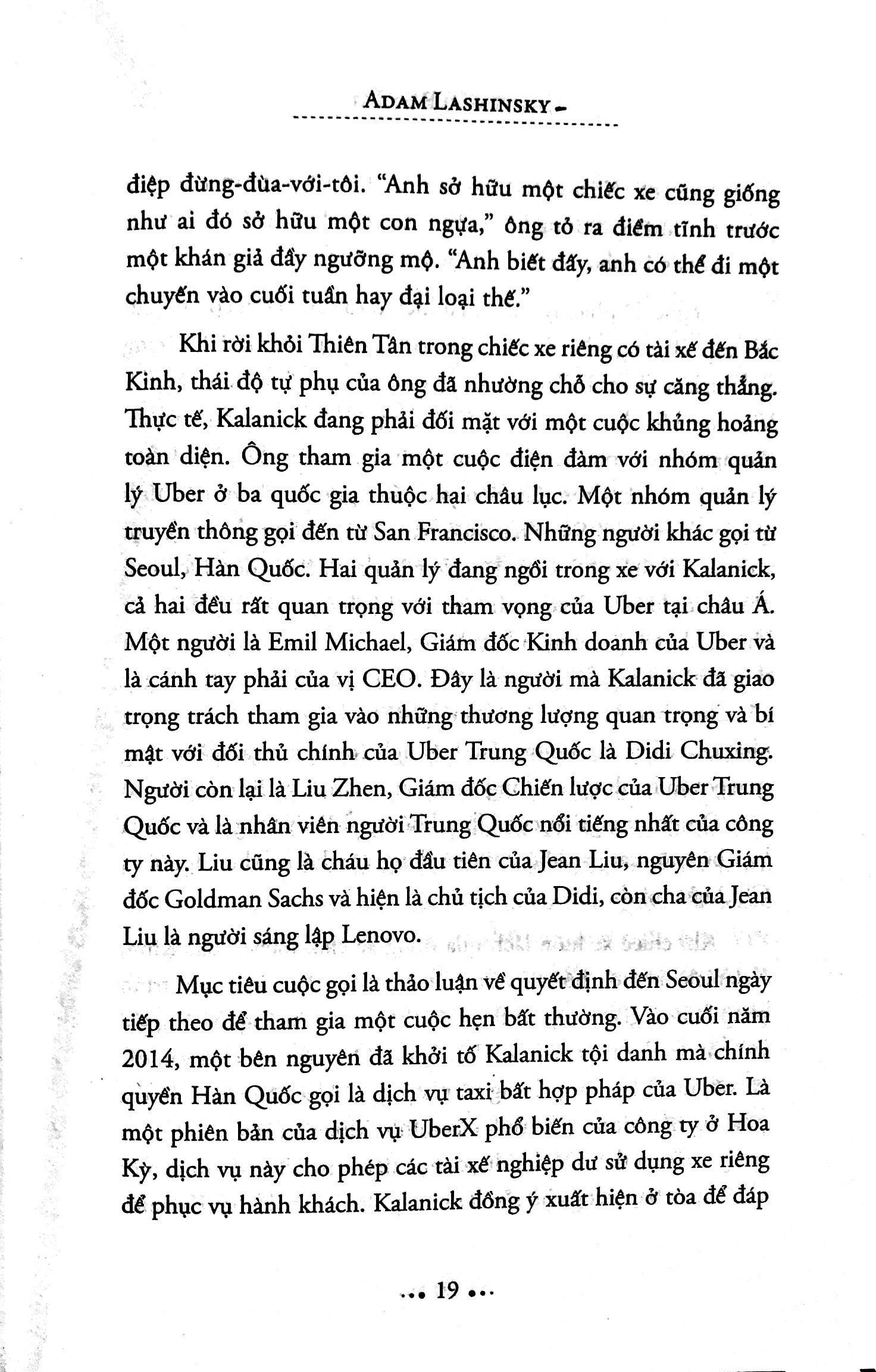 Uber là tiêu đề chính trên các mặt báo mỗi ngày nhưng còn rất nhiều điều về quá khứ và tương lai của công ty này mà chúng ta chưa biết. Lashinky sẽ kể cho chúng ta câu chuyện Uber qua cuốn sách giàu thông tin, được nghiên cứu kỹ lưỡng về công nghệ làm gián đoạn thị trường và vị CEO có tầm nhìn xa nhưng cũng đầy táo tợn.