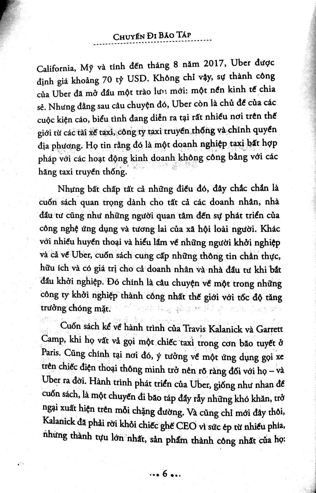 Trong Chuyến đi bão táp, Adam Lashinsky – cây bút kỳ cựu của Fortune sẽ vén tấm màn tăng trưởng chóng mặt của Uber từ xuất phát điểm khó khăn đến những kế hoạch mở rộng dịch vụ dựa trên nền tảng và mạng lưới sẵn có của công ty. Uber đang chiến đấu với các đối thủ và nhà cầm quyền khắp nơi trên thế giới để chiếm lĩnh thị trường; họ đã đối mặt với những cuộc biểu tình ở các thành phố lớn như Paris, Rio de Janeiro và Mumbai. Họ đã đối đầu và thất bại trong cuộc chiến đắt đỏ và hao tâm tổn trí với Didi ở thị trường Trung Quốc. Uber cũng tuyển những kỹ sư từ các viện nghiên cứu hàng đầu để phát triển chiếc xe tự hành có khả năng thay thế những tài xế mà họ đã nỗ lực để tuyển dụng.