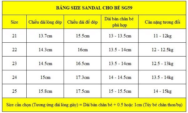BẢNG SIZE SANDAL BÉ GÁI SG59