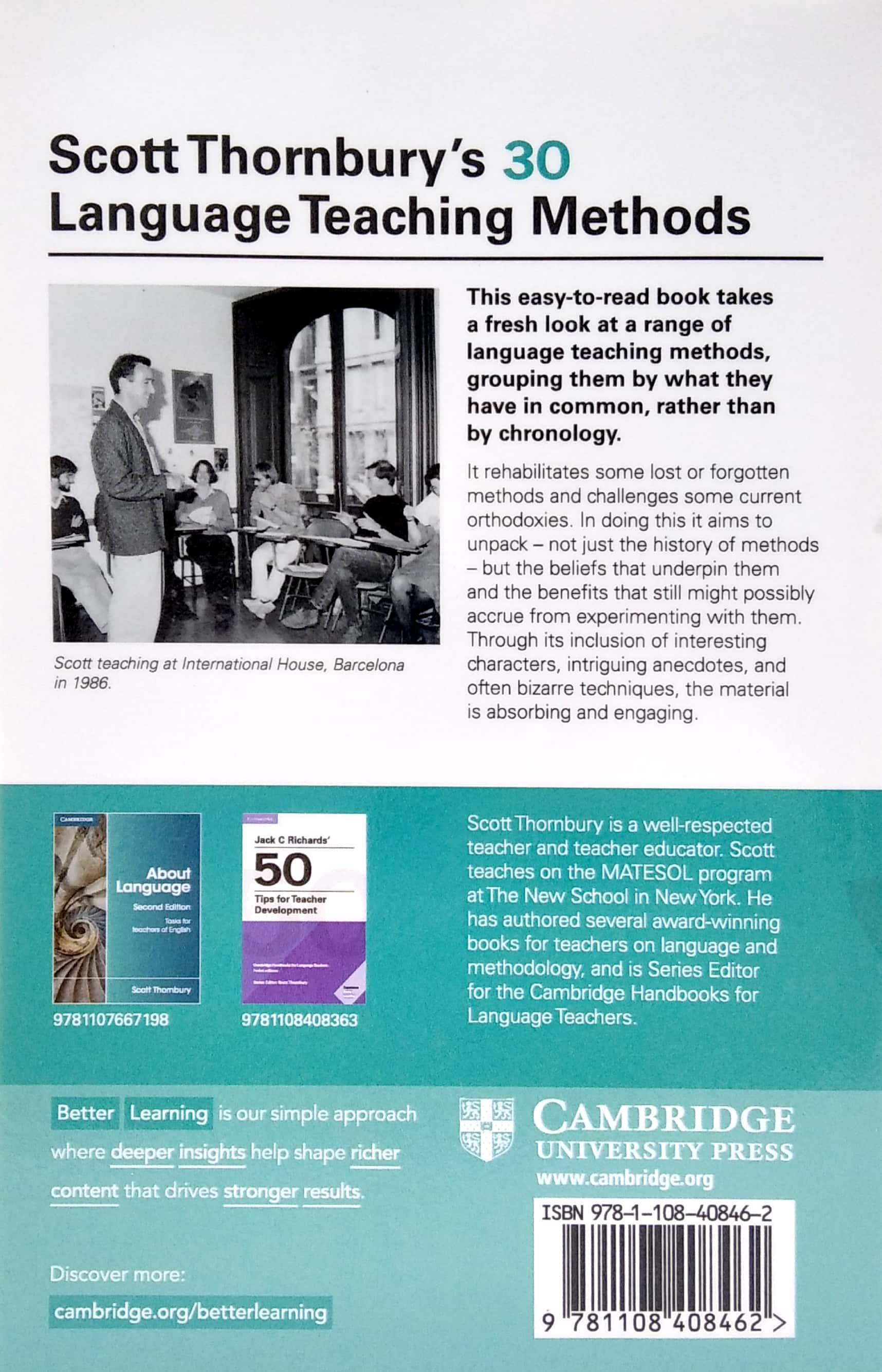 Scott Thornbury's very accessible 30 Teaching Methods, groups methods according to what they have in common, even if separated in time. At the same time, it rehabilitates some lost or forgotten methods, with a view to challenging current orthodoxies, especially with regard to such topics as translation, rote learning, authenticity, and communication. In doing this it aims to unpack, not just the history of methods, but the beliefs that underpin them and the benefits that still might possibly accrue from experimenting with them. Through its inclusion of interesting characters, intriguing anecdotes, and often bizarre techniques, the material is absorbing and engaging.