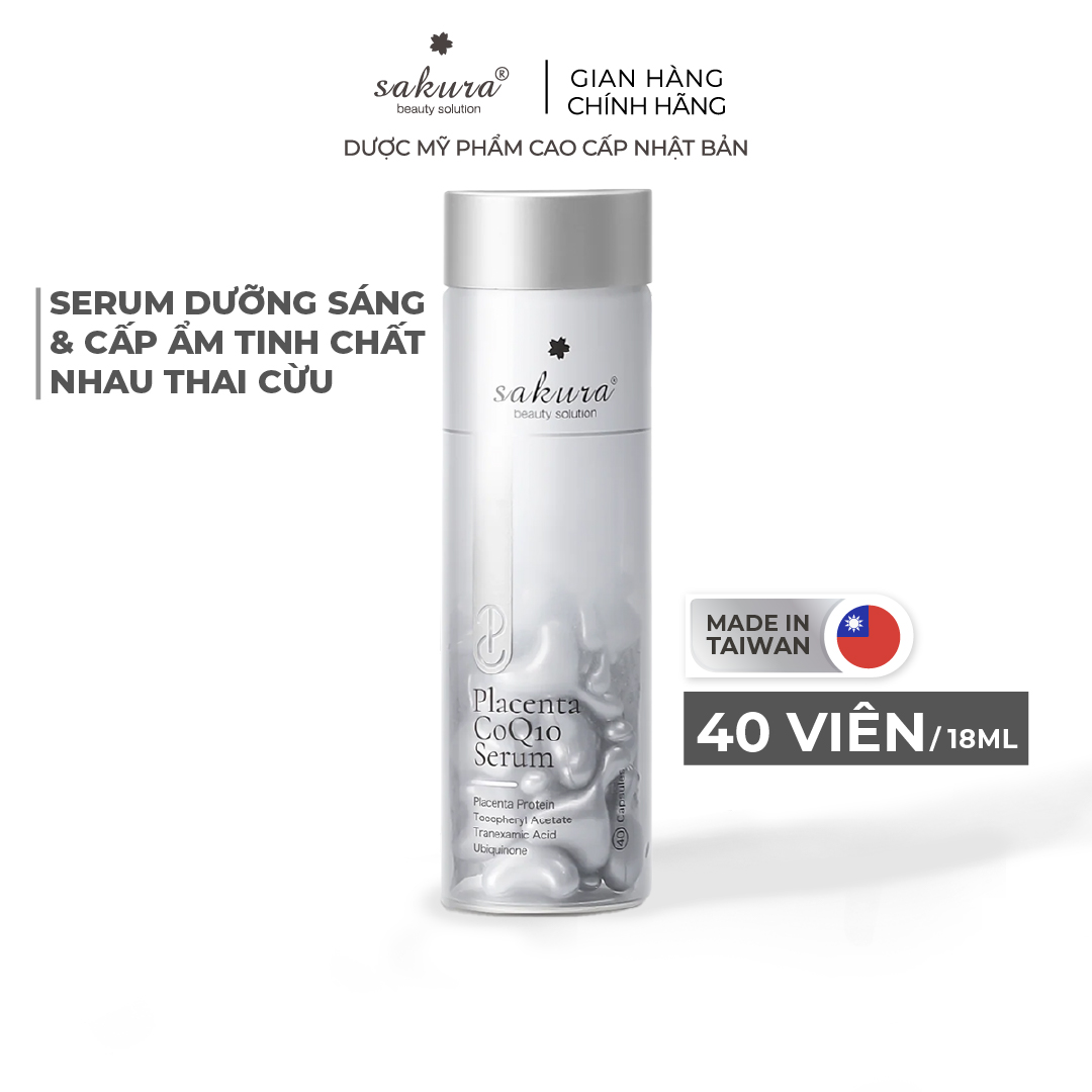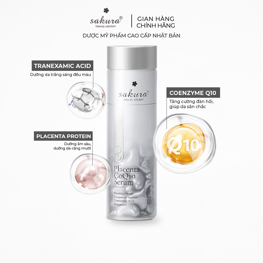 Serum dưỡng trắng da, chống lão hóa tinh chất nhau thai cừu Sakura Placenta COQ10 Serum với công thức dưỡng trắng da, chống lão hóa hoàn hảo từ sự kết hợp của Tranexamic Acid - CoQ10 - Placenta - Vitamin E tồn tại ở dạng phân tử siêu nhỏ dễ dàng thẩm thấu vào da, đẩy nhanh hiệu quả làm sáng mịn, cải thiện độ săn chắc và đàn hồi, giúp giảm cả tình trạng da khô và đánh bật các dấu hiệu lão hóa xuất hiện.
