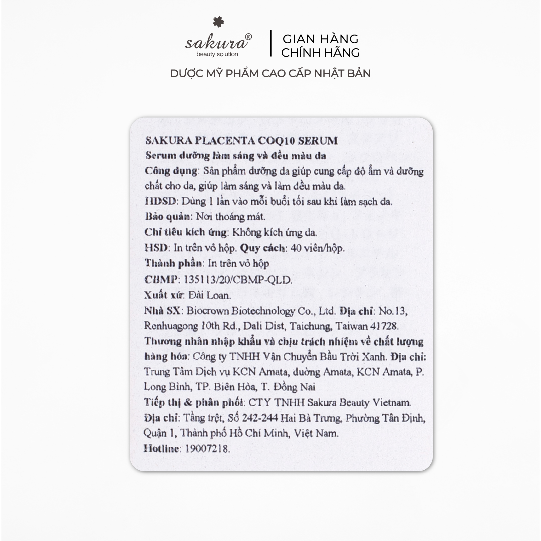 Thông số kỹ thuật Serum dưỡng trắng da chống lão hóa tinh chất nhau thai cừu Sakura Placenta COQ10 serum xuất xứ Nhật Bản 40 viên
