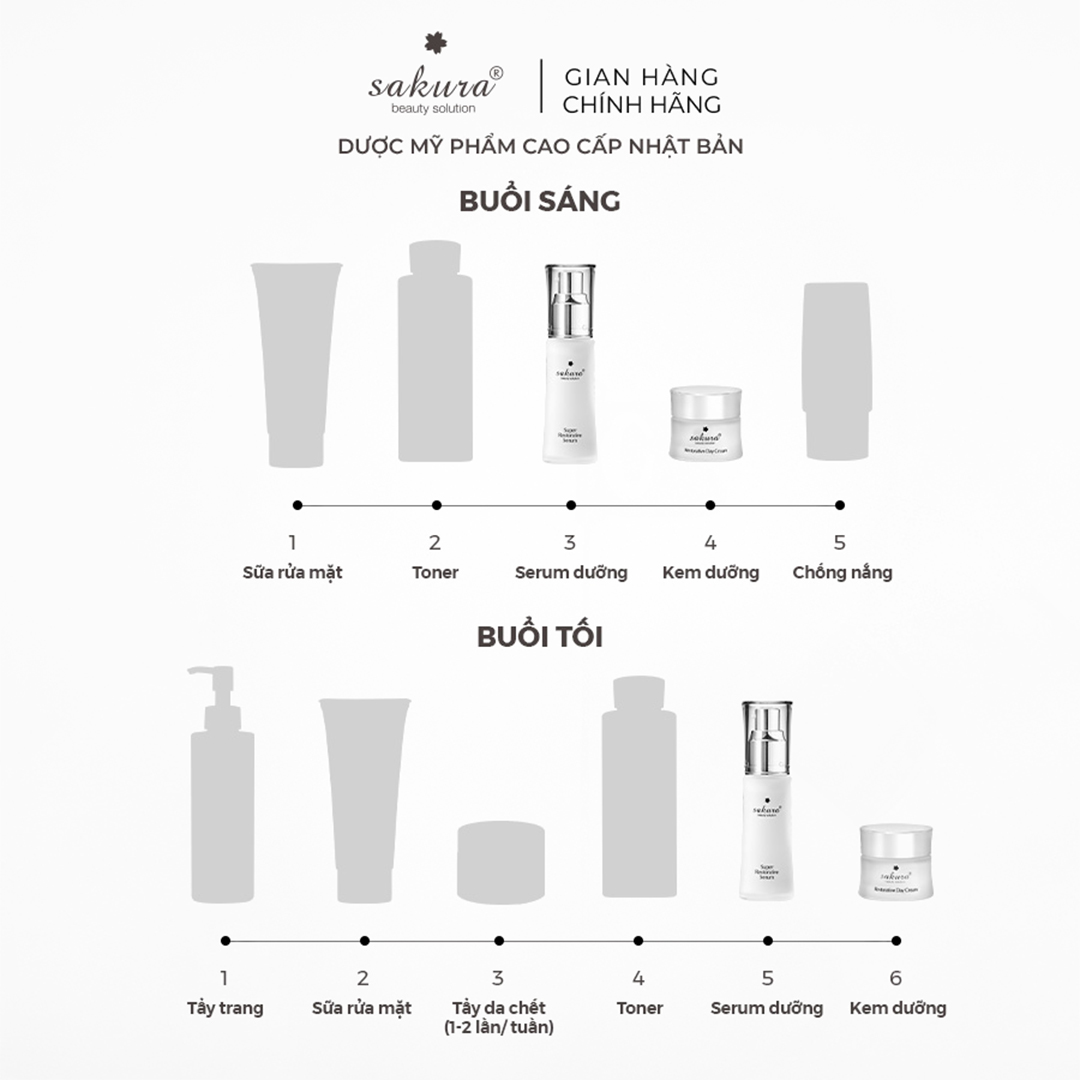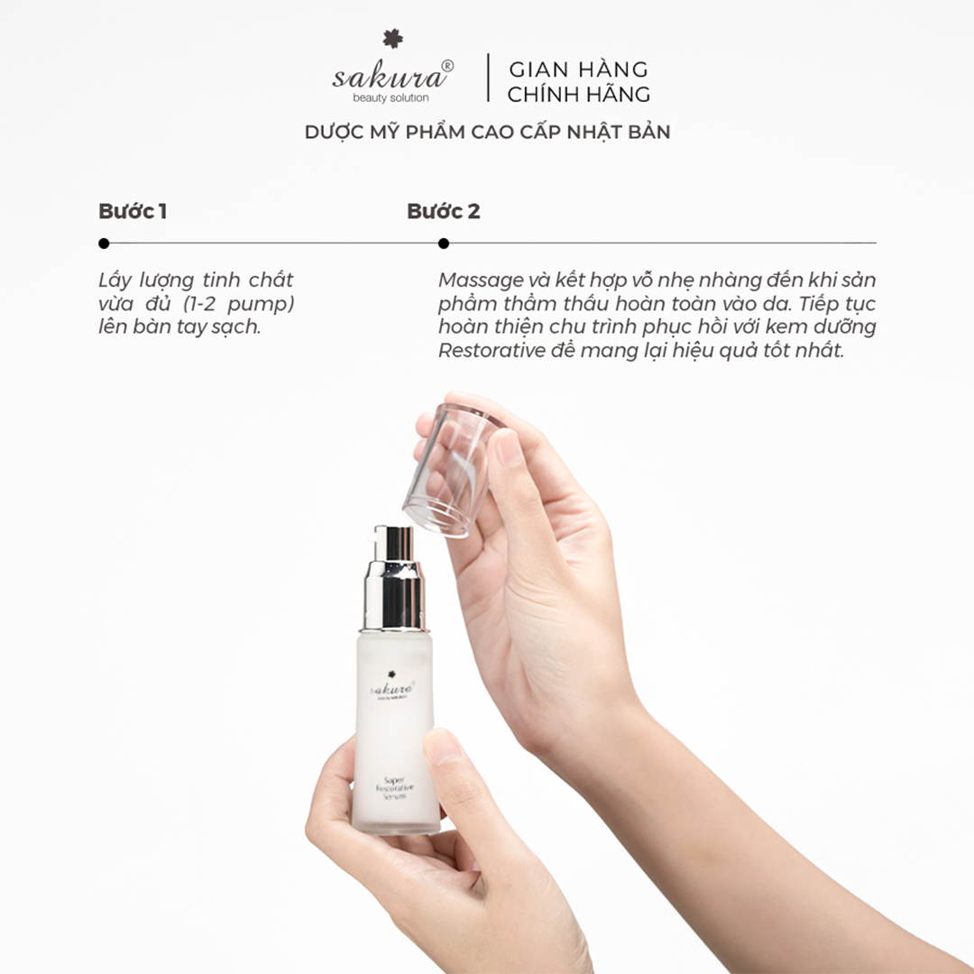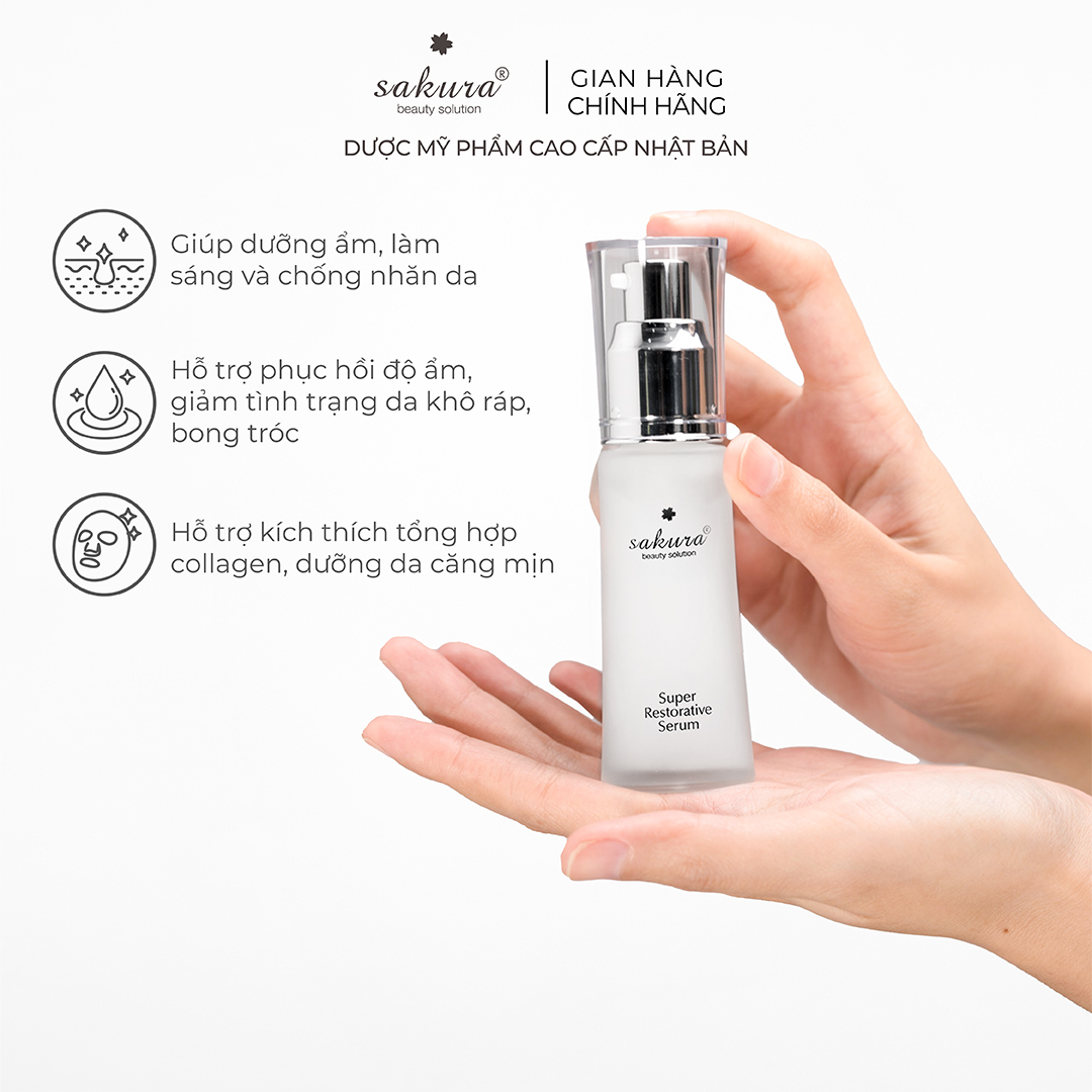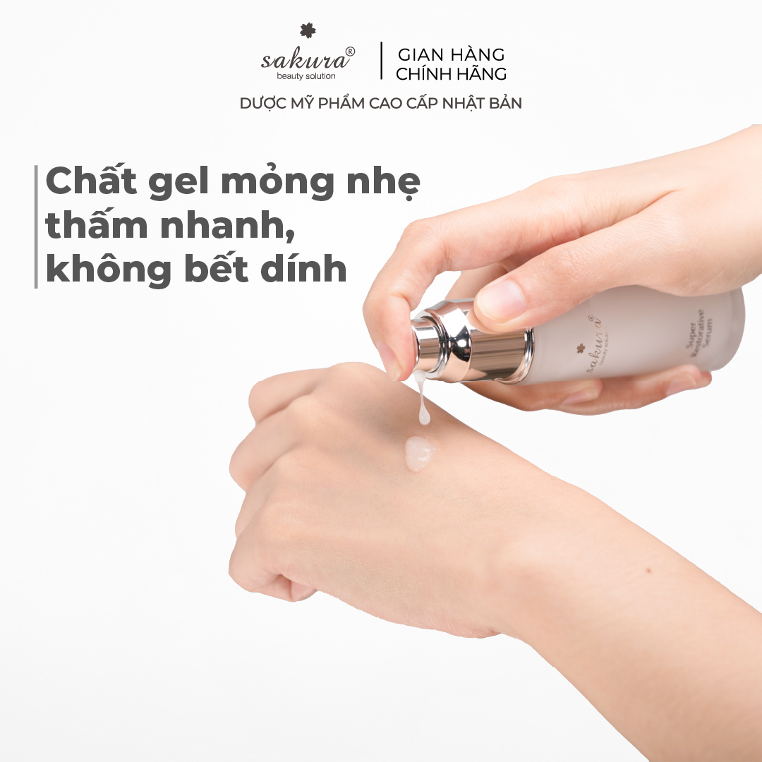 Serum dưỡng phục hồi chống lão hoá da Sakura Super Restorative Serum Công thức phức hợp độc quyền gồm Collagen, Hyaluronic Acid và Placenta với phân tử siêu nhỏ giúp gia tăng tính đàn hồi và độ săn chắc của da bằng việc kích thích sự tổng hợp collagen và đẩy mạnh sự liên kết giữa các tế bào. Các thành phần với phân tử siêu nhỏ giúp tác động sâu đến hạ bì, dưỡng ẩm sâu đồng thời cải thiện cấu trúc sinh học da, đánh thức nguồn năng lượng dưới da, tăng cường làm đều tone màu da, mang lại kết quả ấn tượng trong việc tái tạo làn da trẻ trung, khoẻ khoắn, rạng ngời.