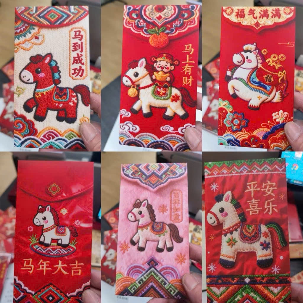 Set Lì Xì Ngựa Thêu In Bìa Đẹp, Bao lì xì Tết Bính Ngọ 2026, Loại Dày Sắc Nét