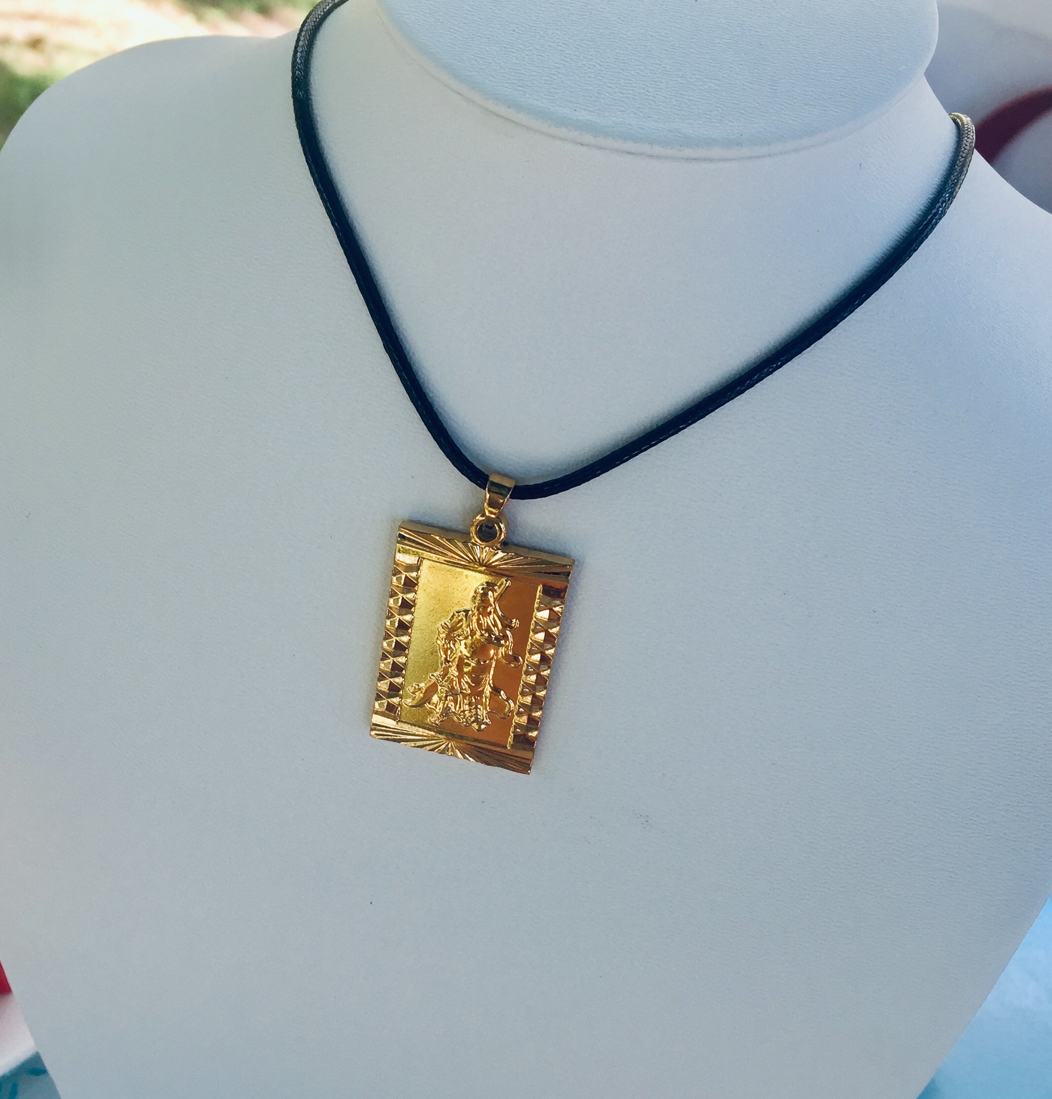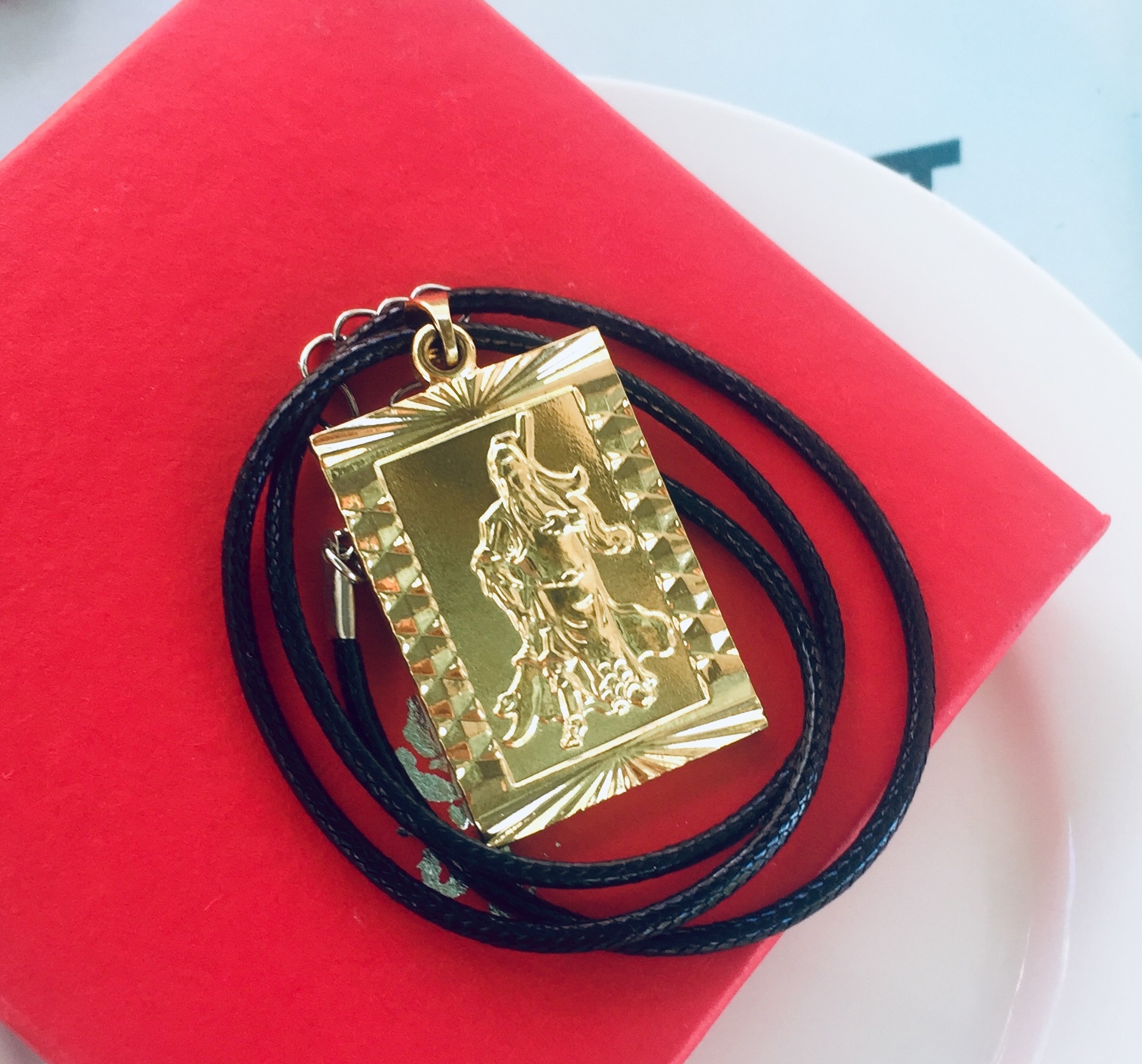 Thông số kỹ thuật Set Mặt Dây Chuyền Mạ Vàng 18K Đúc Hình Quan Công, Kèm dây đeo da và hộp đựng trang sức.