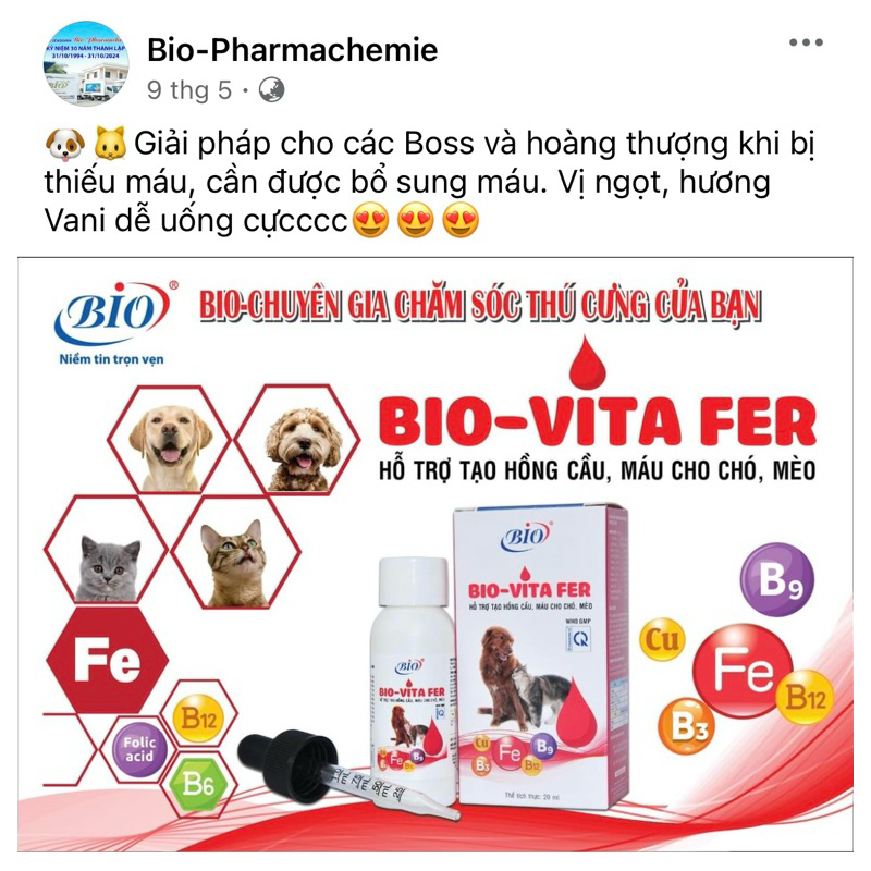 * Bio Vita Fer hỗ trợ tạo hồng cầu, tạo máu cho chó mèo: sau khi sinh, sau phẫu thuật, các trường hợp thiếu máu.