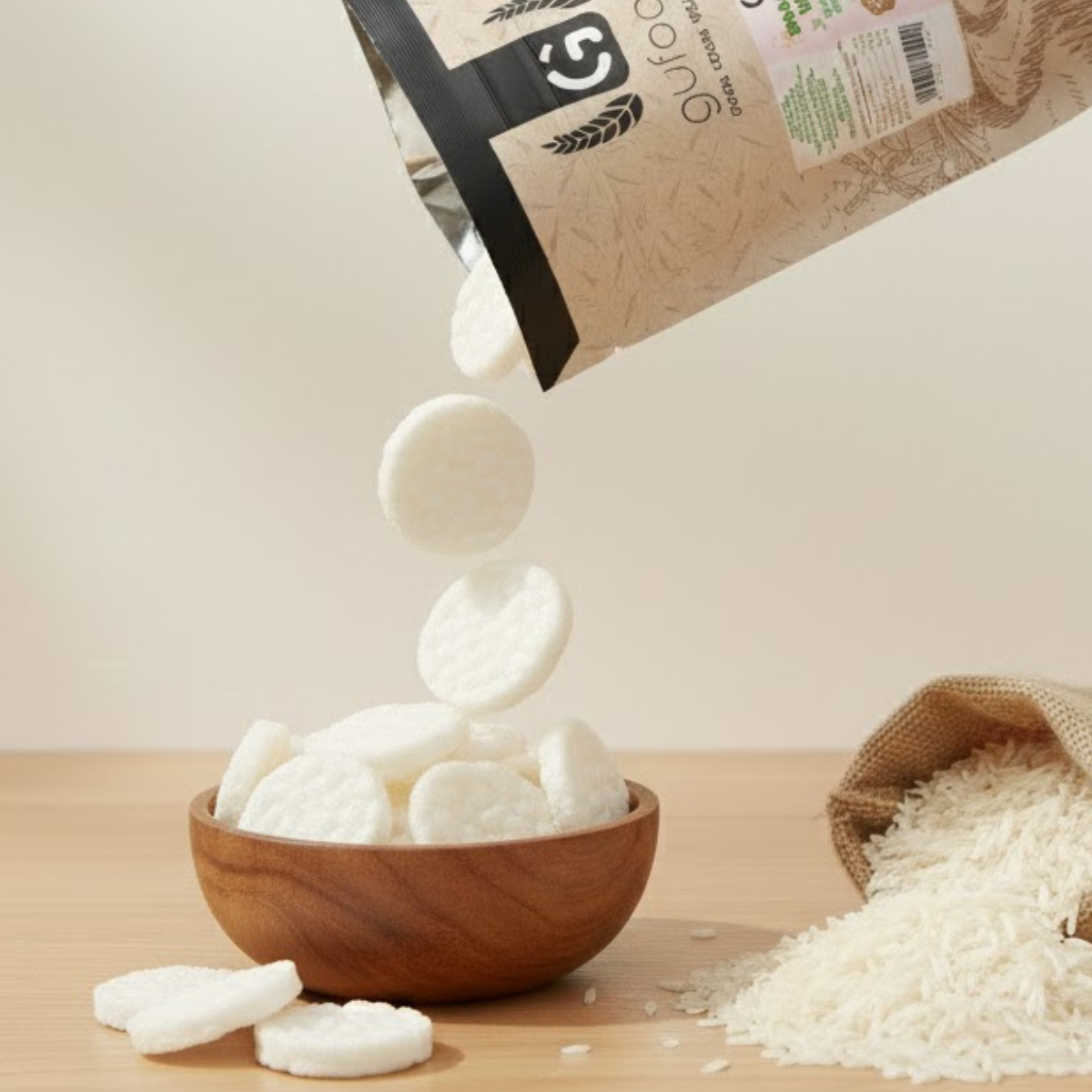 Snack gạo hữu cơ giòn rụm từ lần cắn đầu tiên, càng nhai sẽ càng cảm nhận rõ vị ngọt nhẹ nhàng từ hạt gạo.