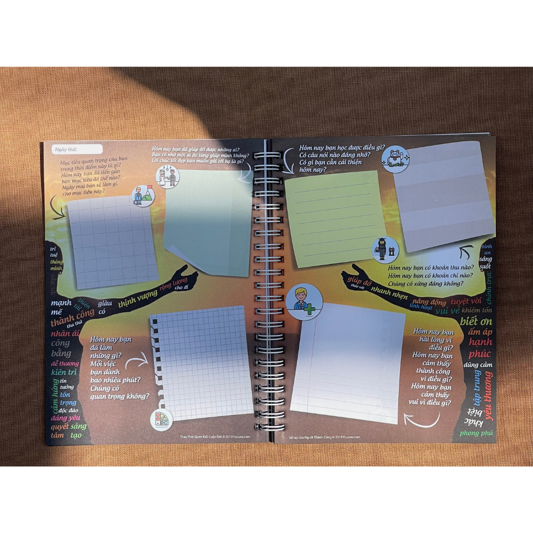 Cuốn sổ được thiết kế để cụ thể hoá nguyên tắc này, những câu hỏi vàng cùng các giá trị tốt đẹp của người thành công sẽ ngấm vào tiềm thức, và giúp bản thay đổi trong mọi lãnh vực. Khi lật ra bất cứ trang nào, bạn cũng sẽ thấy ở 3 phần thú vị: