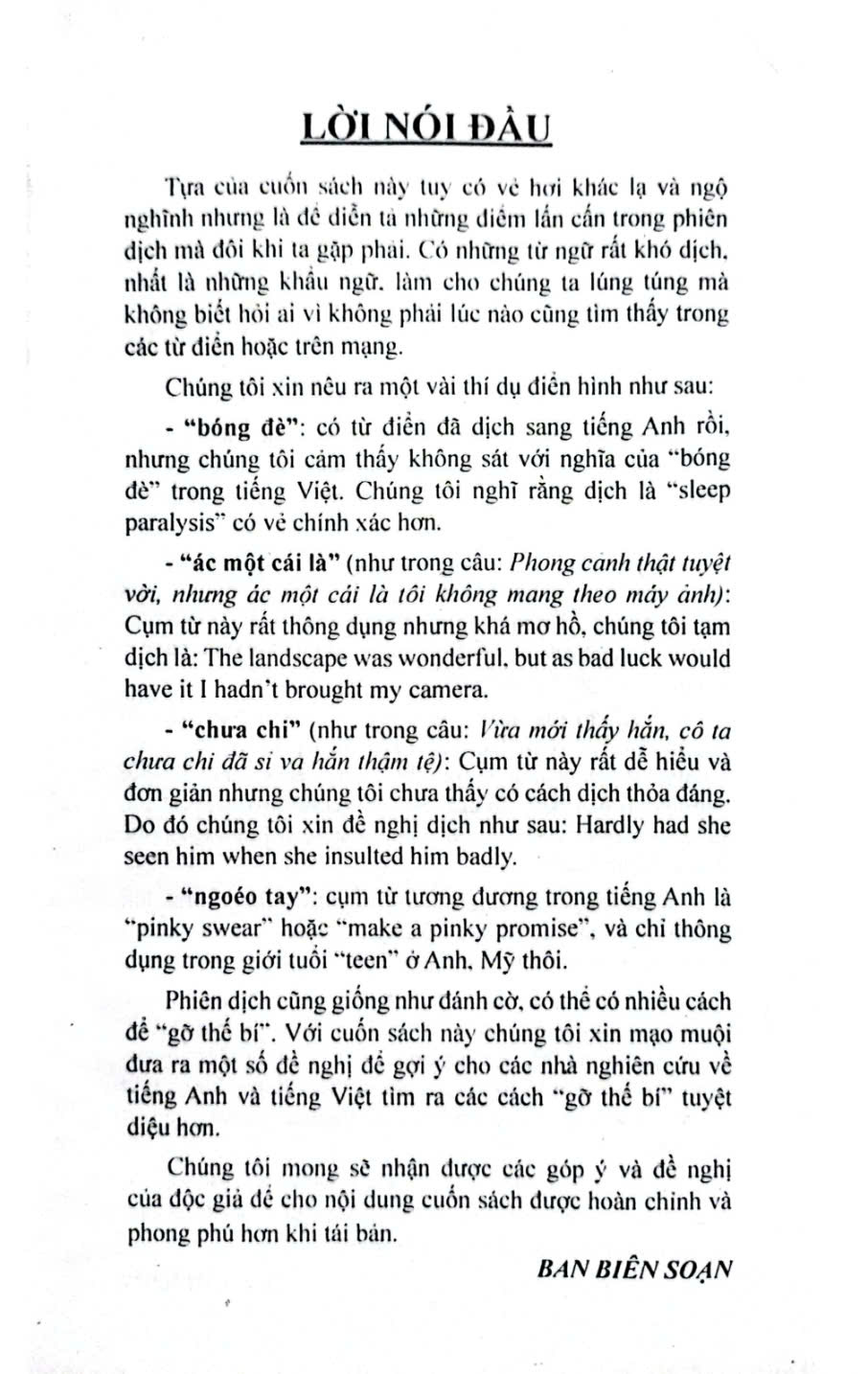 Trong phiên dịch , cũng như trong nghệ thuật đánh cờ, có thể có nhiều cách để "gỡ thế bí". Với cuốn sách này chúng tôi xin mạo muội đưa ra một số đề nghị để gợi ý cho các nhà nghiên cứu về tiếng Anh và tiếng Việt tìm ra các cách "gỡ thế bí" tuyệt diệu hơn.