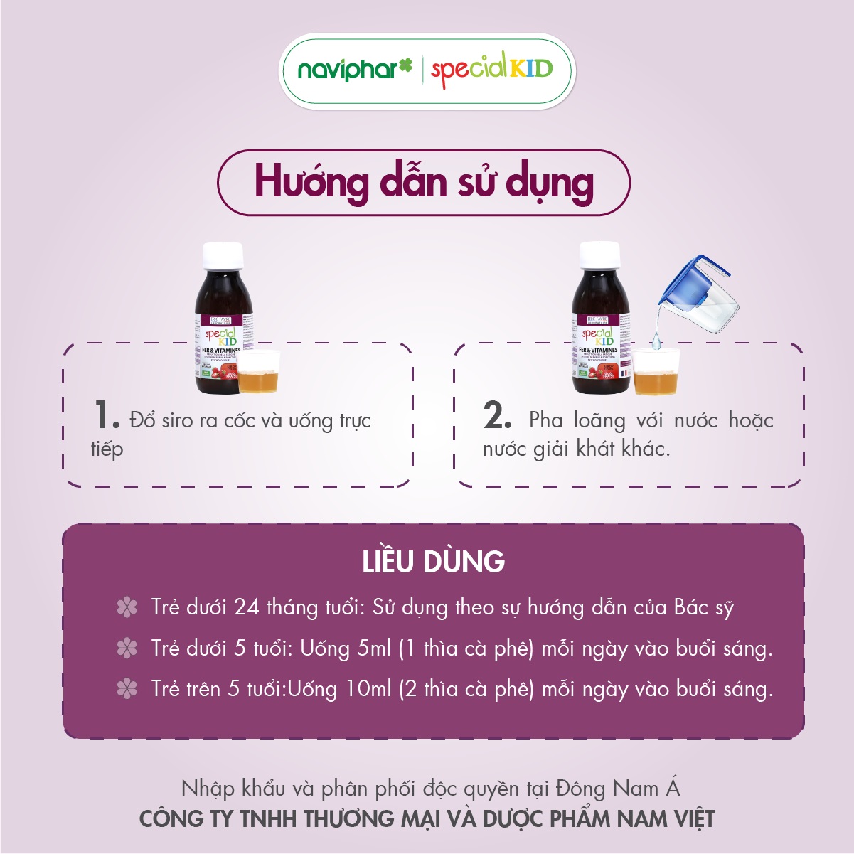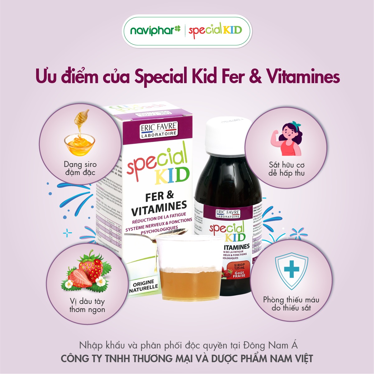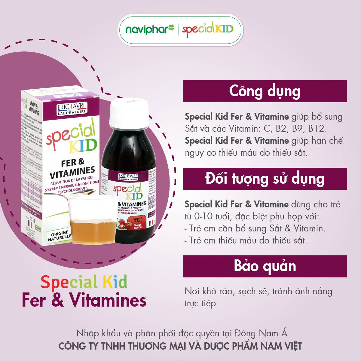 Thông số kỹ thuật SPECIAL KID FER & VITAMINES - Siro Bổ sung sắt và các vitamin C, B2, B9, B12 - Giúp giảm thiếu máu do thiếu sắt - Nhập khẩu Pháp (125ml)