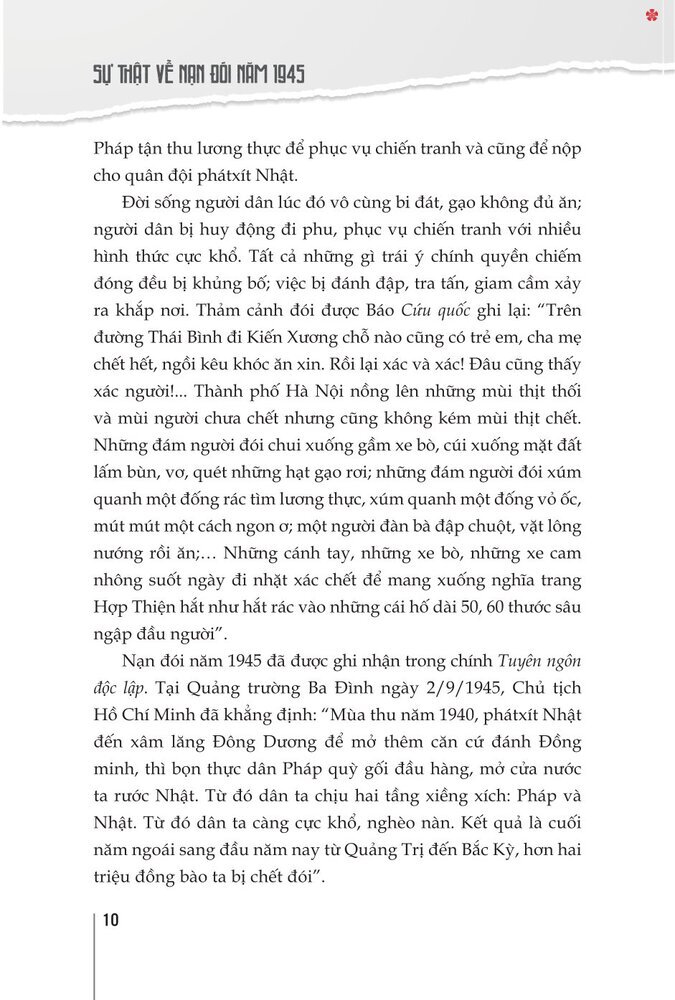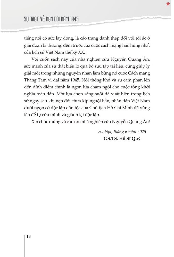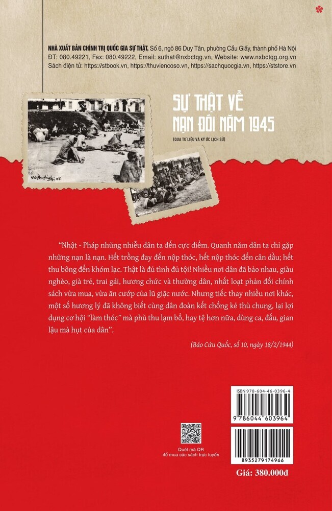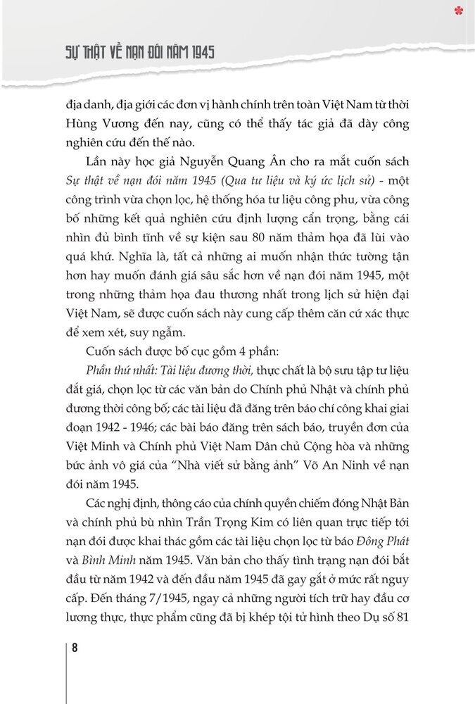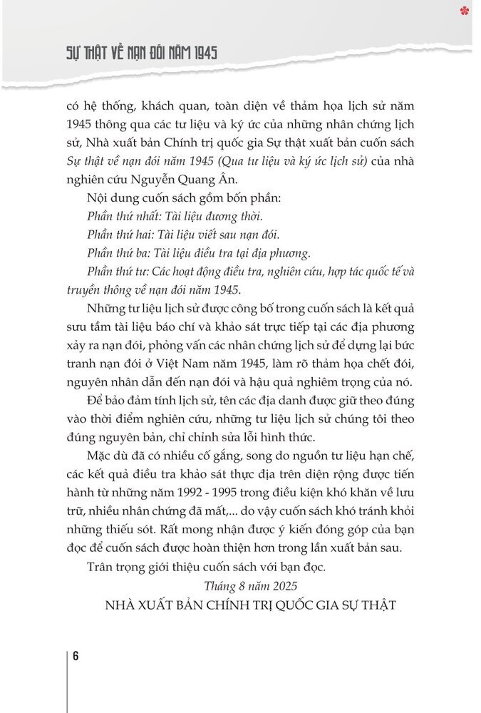 Mặc dù lịch sử đã lùi xa nhưng trong ký ức người Việt Nam, “nạn đói năm Ất Dậu” vẫn là nỗi đau, cơn ác mộng, sự nhức nhối khó quên. Nhằm cung cấp cho bạn đọc những thông tin có hệ thống, khách quan, toàn diện về thảm họa lịch sử năm 1945 thông qua các tư liệu và ký ức của những nhân chứng lịch sử, Nhà xuất bản Chính trị quốc gia Sự thật xuất bản cuốn sách Sự thật về nạn đói năm 1945 (Qua tư liệu và ký ức lịch sử) của nhà nghiên cứu Nguyễn Quang Ân.