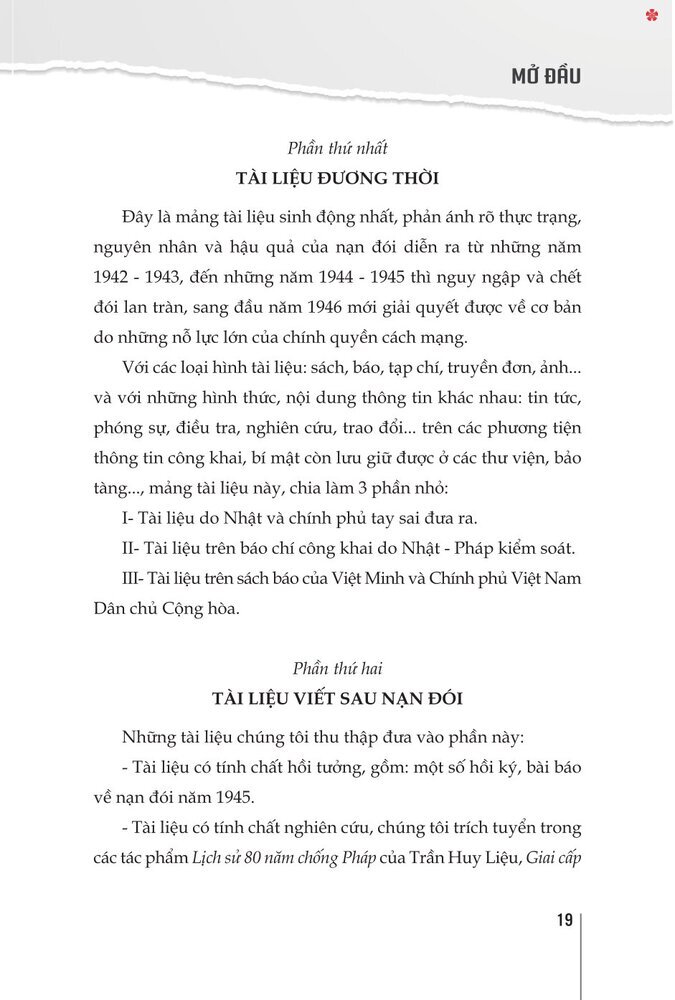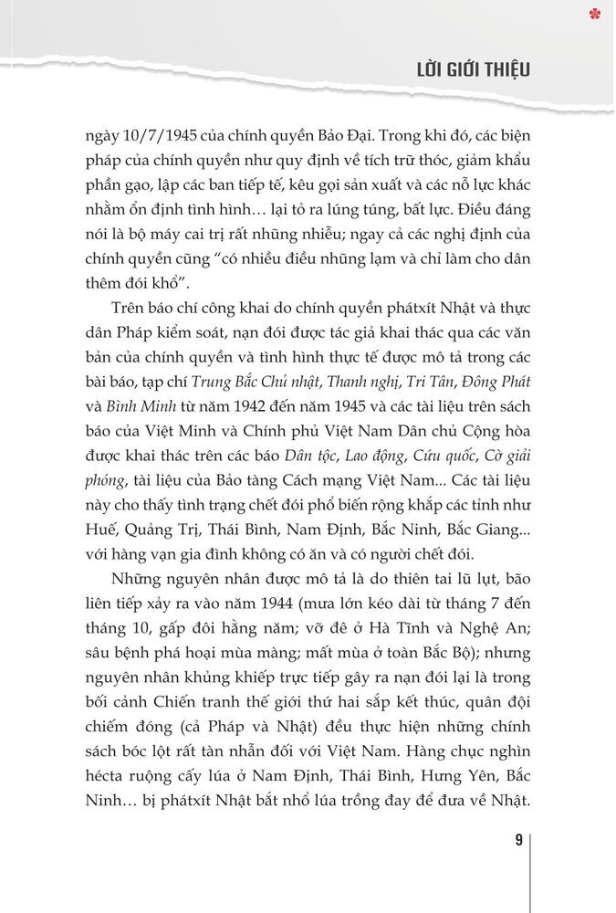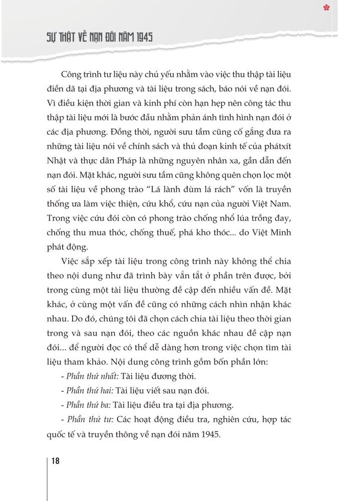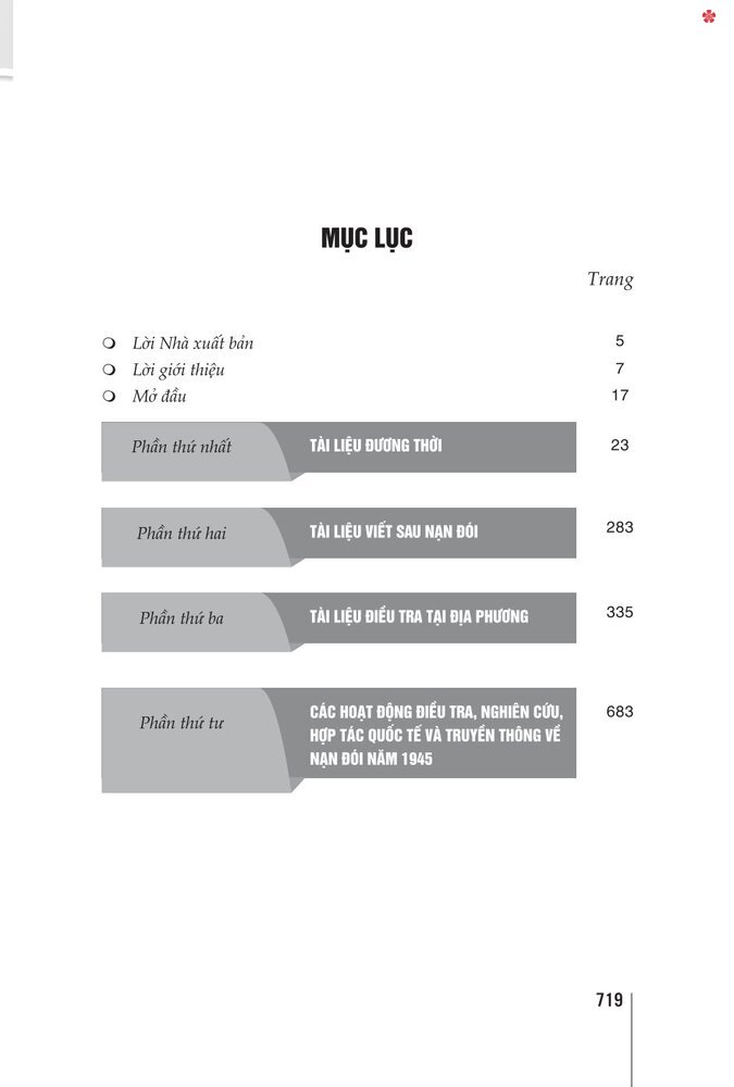 Những tư liệu lịch sử được công bố trong cuốn sách là kết quả sưu tầm tài liệu báo chí và khảo sát trực tiếp tại các địa phương xảy ra nạn đói, phỏng vấn các nhân chứng lịch sử để dựng lại bức tranh nạn đói ở Việt Nam năm 1945, làm rõ thảm họa chết đói, nguyên nhân dẫn đến nạn đói và hậu quả nghiêm trọng của nó.