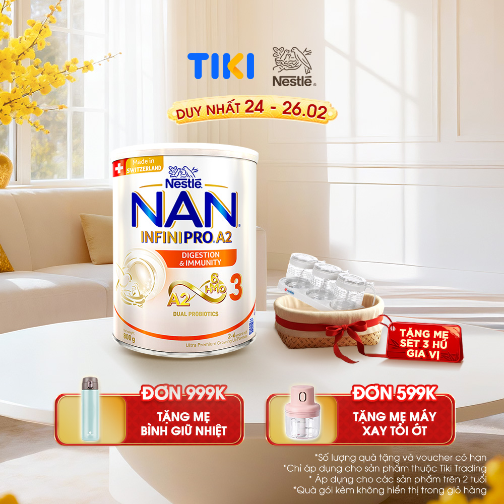 Thông số kỹ thuật Sữa bột NAN INFINIPRO A2 800g Thụy Sĩ 3 với đạm quý A2 tiêu hóa tốt sau 7 ngày và 6HMO tăng cường đề kháng + Tặng Set 3 hũ nha vị (2 - 6 tuổi)