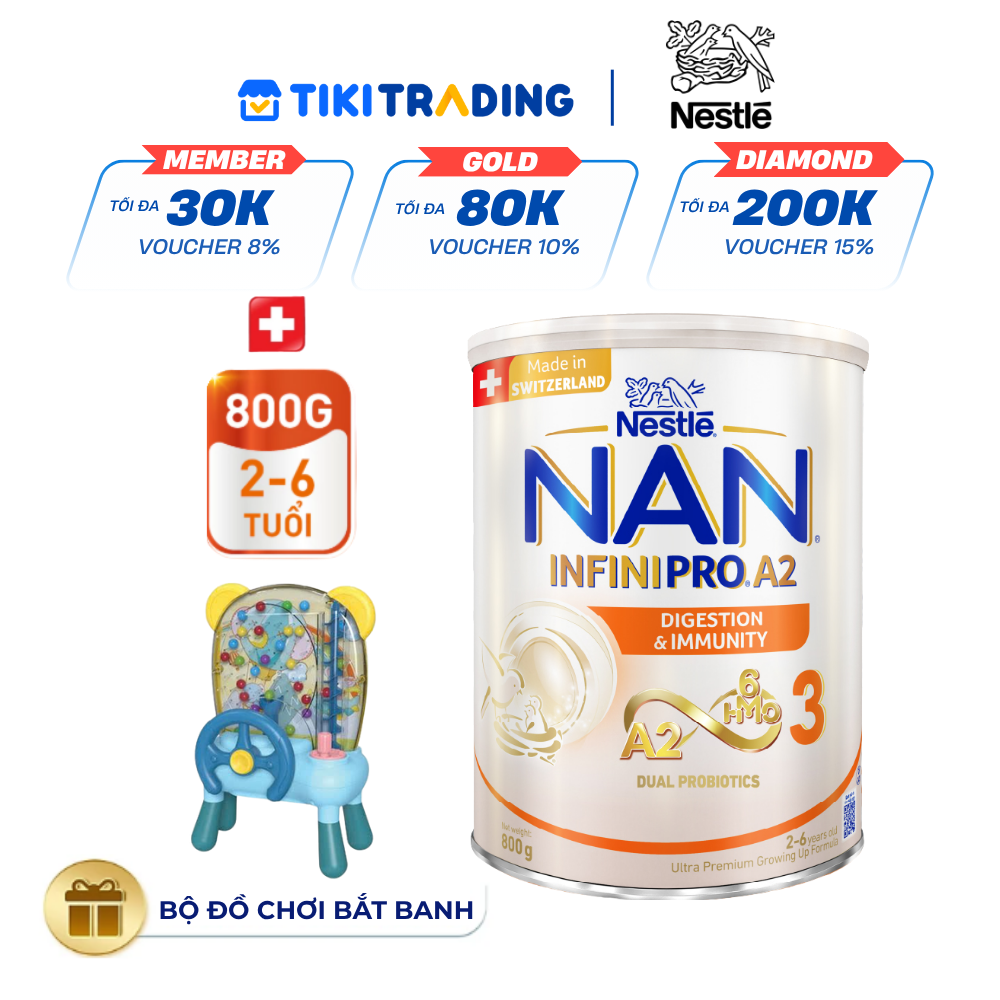 Thông số kỹ thuật Sữa bột NAN INFINIPRO A2 800g Thụy Sĩ 3 với đạm quý A2 tiêu hóa tốt sau 7 ngày và 6HMO tăng cường đề kháng (2 - 6 tuổi) - Tặng Đồ chơi bắt banh