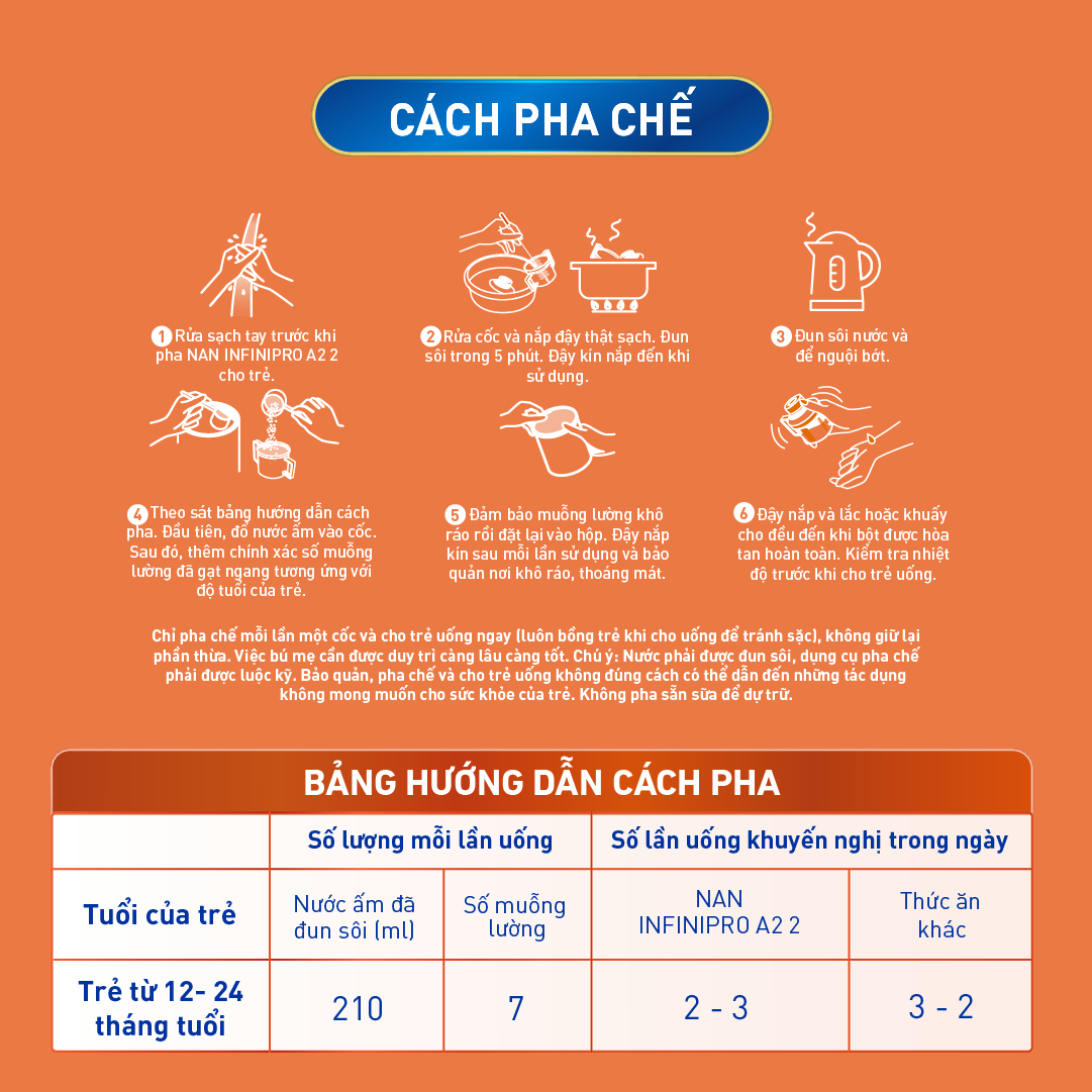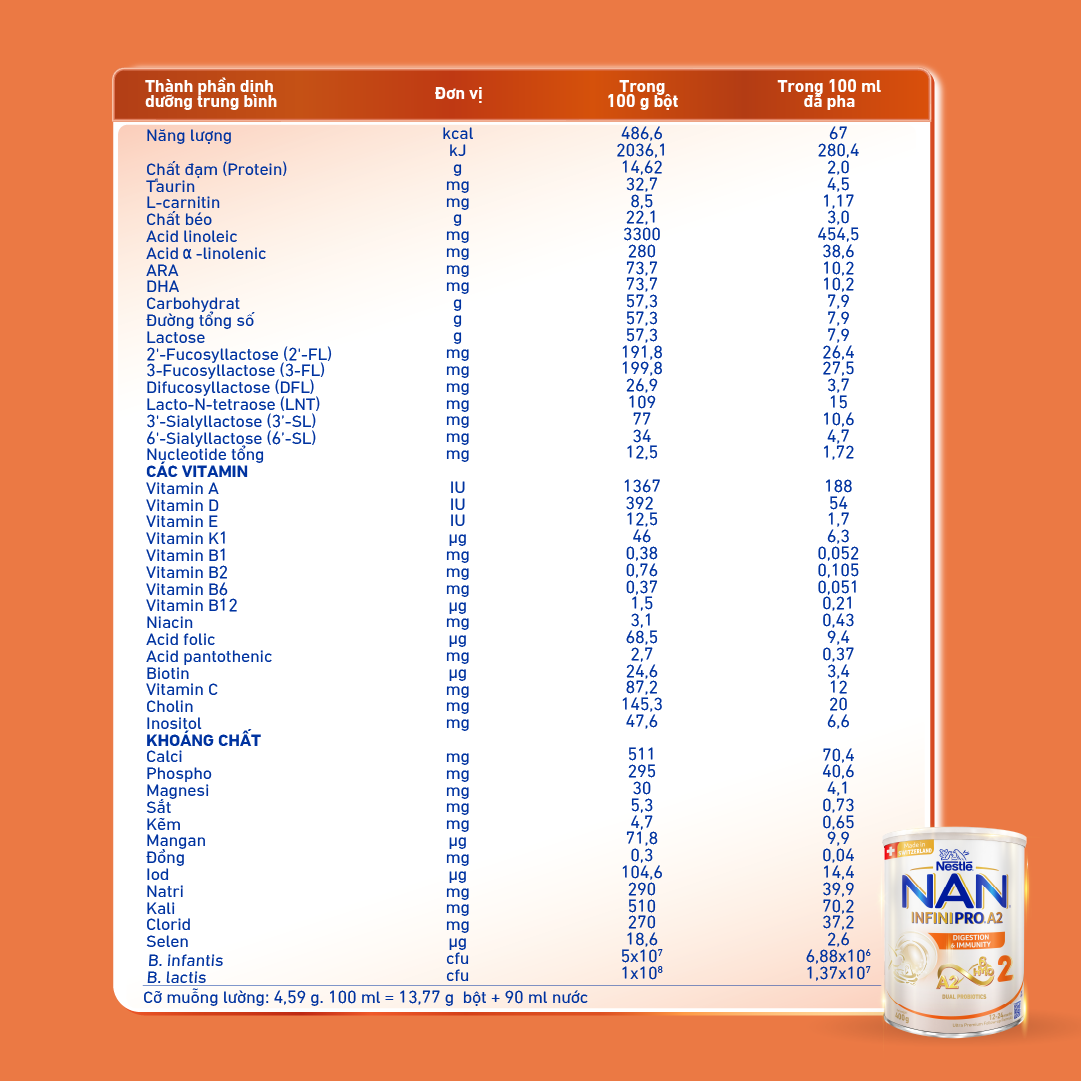 Thông số kỹ thuật Sữa bột NAN INFINIPRO A2 2 với công thức đầu tiên kết hợp giữa đạm quý A2 & 6HMO & Dual Probiotics nhập khẩu Thụy Sĩ - Hộp 400g cho bé 12 - 24 tháng