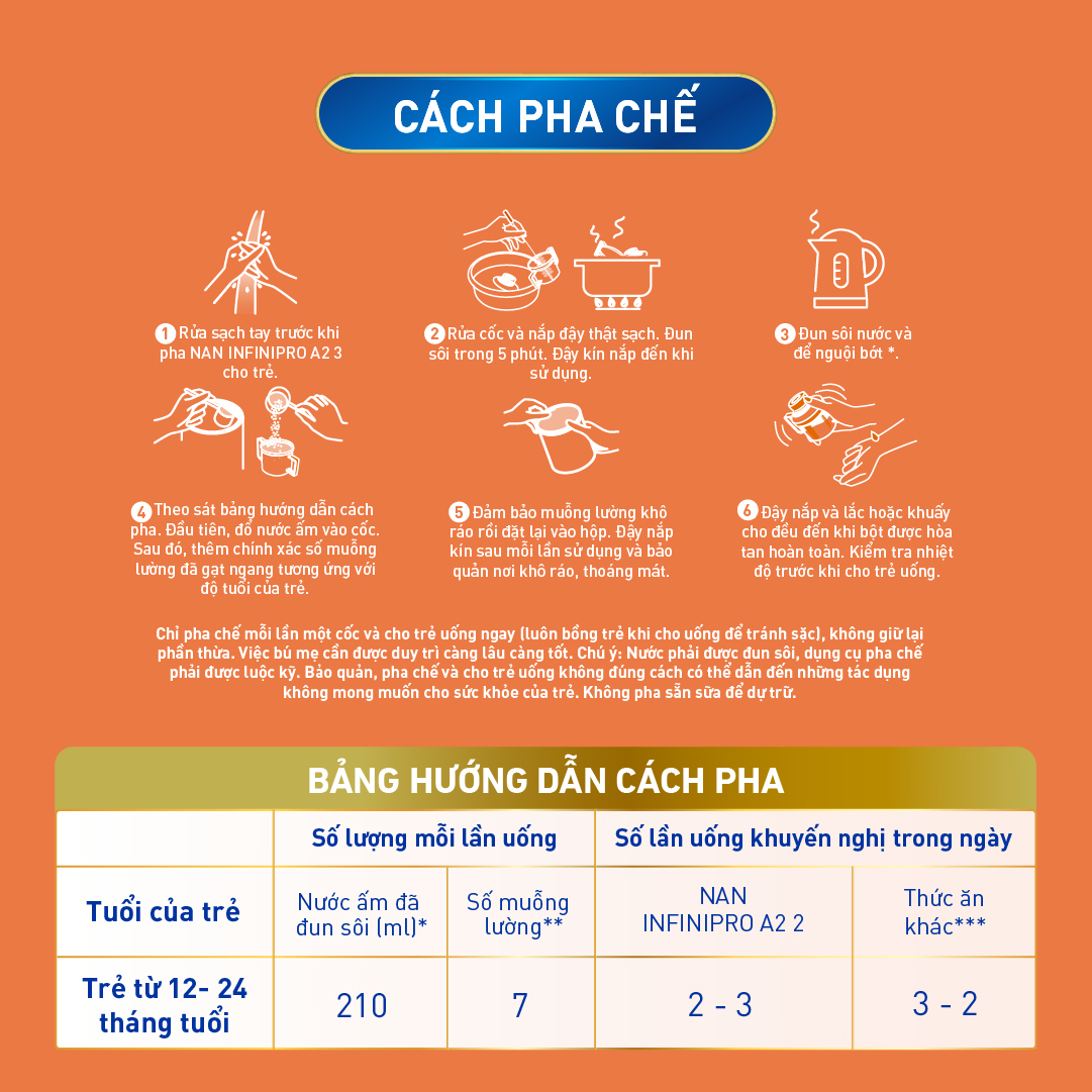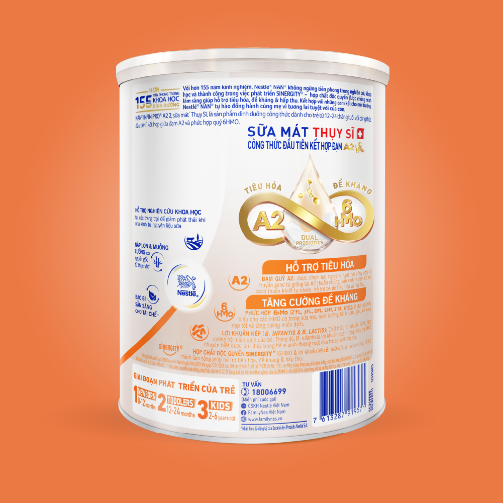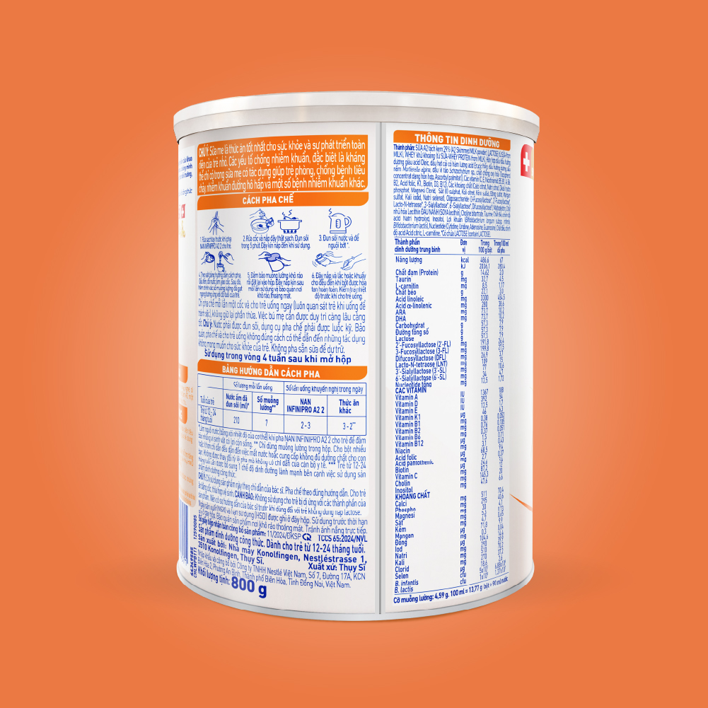 Thông số kỹ thuật Sữa bột NAN INFINIPRO A2 2 với công thức đầu tiên chứa đạm A2, 6HMO & Lợi khuẩn kép nhập khẩu Thụy Sĩ - Hộp 800g (12 - 24 tháng)