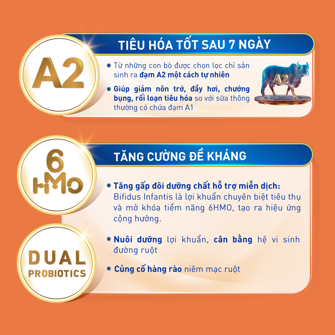 - ĐẠM QUÝ A2: được chọn lọc nghiêm ngặt bởi công nghệ di truyền gene từ giống bò A2 thuần chủng, sản sinh ra đạm A2 một cách thuần khiết tự nhiên, hỗ trợ bé dễ tiêu hóa và hấp thu.