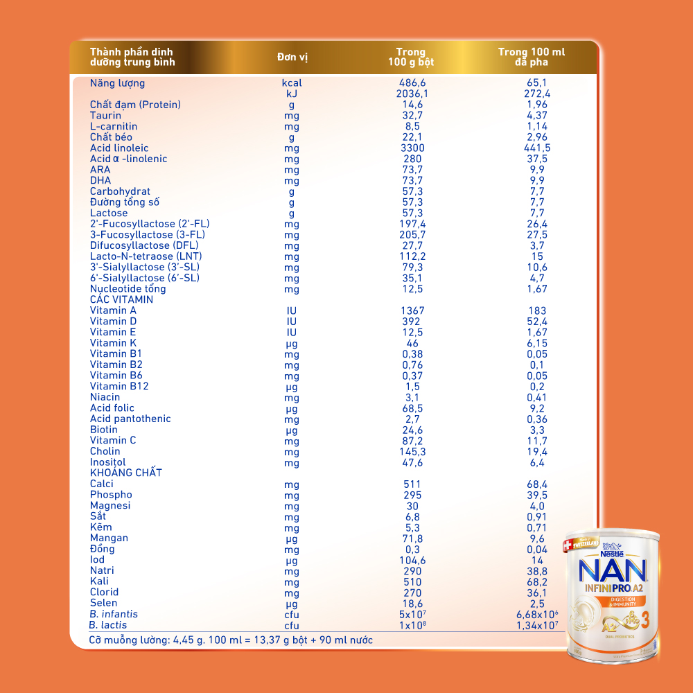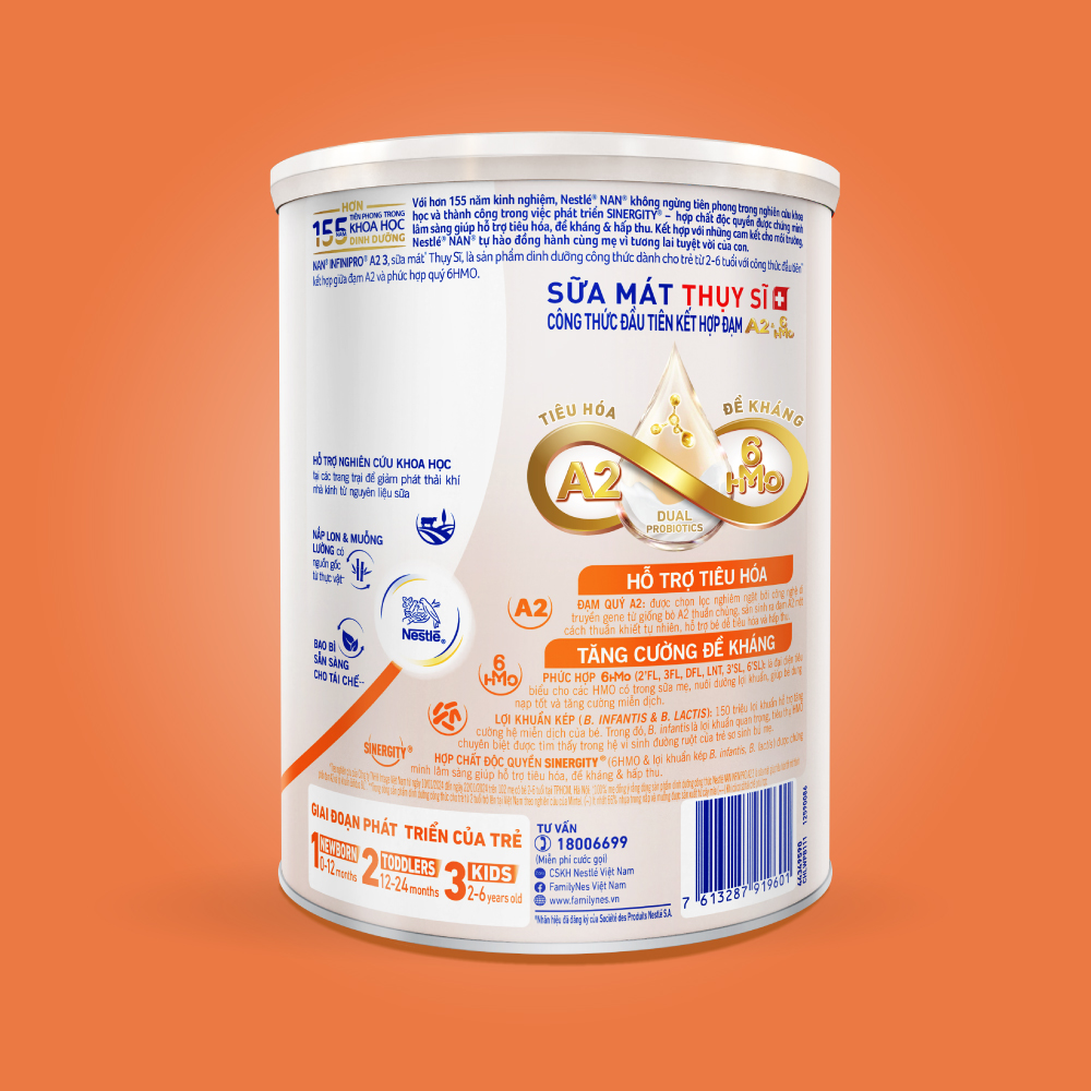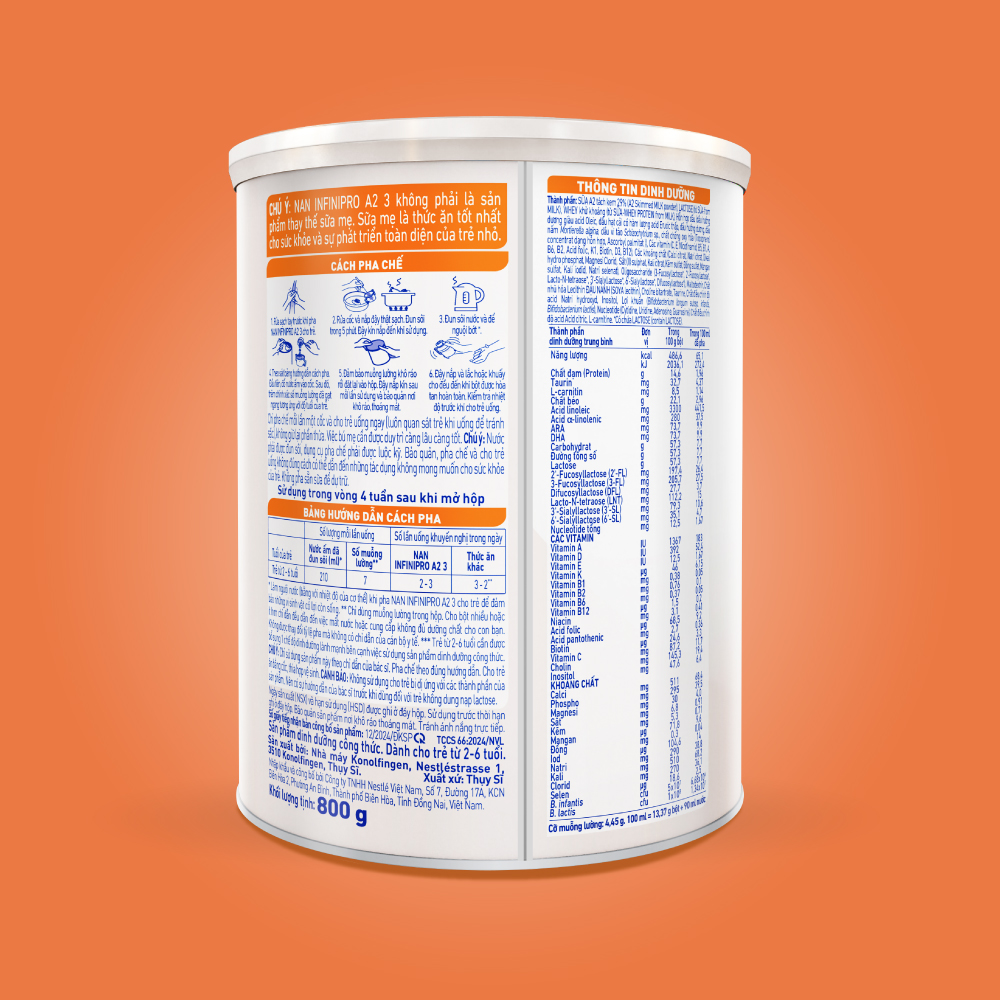 Thông số kỹ thuật Sữa bột NAN INFINIPRO A2 3 với công thức đầu tiên chứa đạm A2, 6HMO & Lợi khuẩn kép nhập khẩu Thụy Sĩ - Hộp 800g (2 - 6 tuổi)