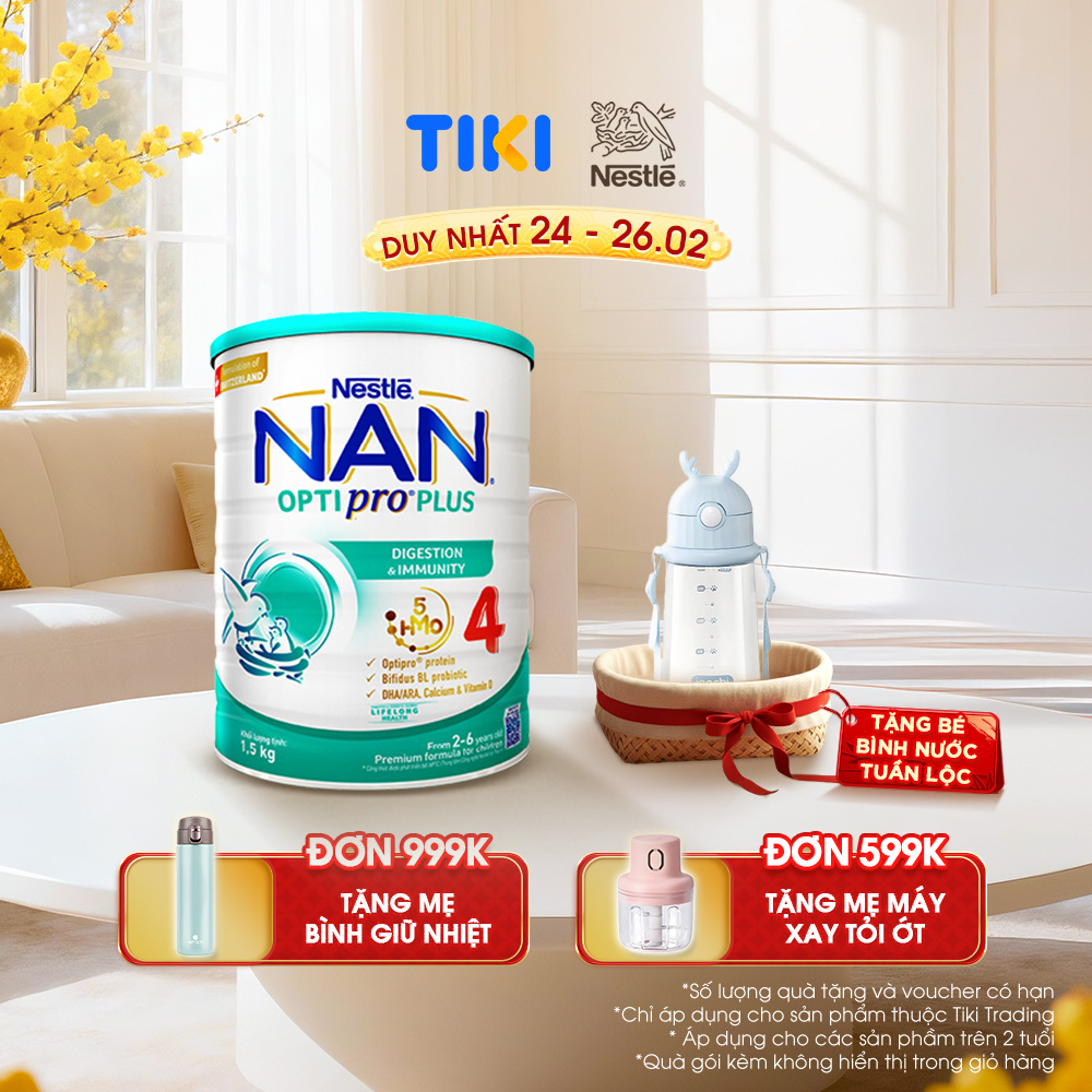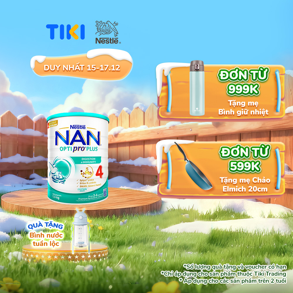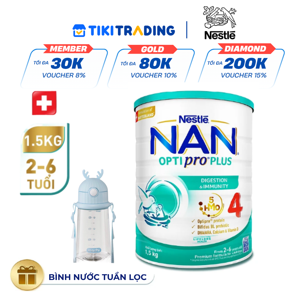 Thông số kỹ thuật Sữa bột Nestlé NAN OPTIPRO PLUS 4 1500g/lon với 5HMO Giúp tiêu hóa tốt + Tăng cường đề kháng (2 - 6 tuổi) - Tặng Bình nước tuần lộc