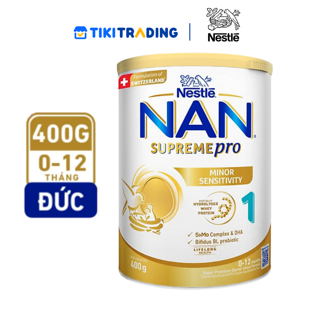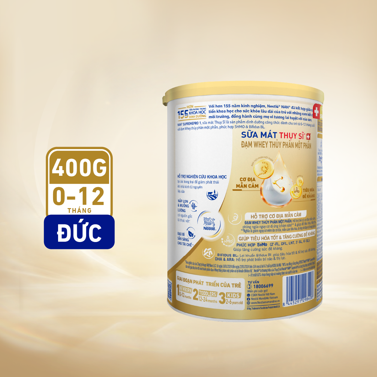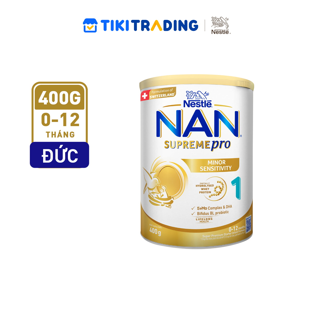 Sản phẩm dinh dưỡng công thức Nestlé NAN Supremepro 1 400G với công thức từ Thụy Sĩ - Sản xuất và đóng gói tại Nestlé Dutschland AG, Đức.