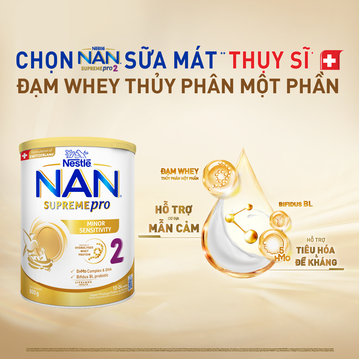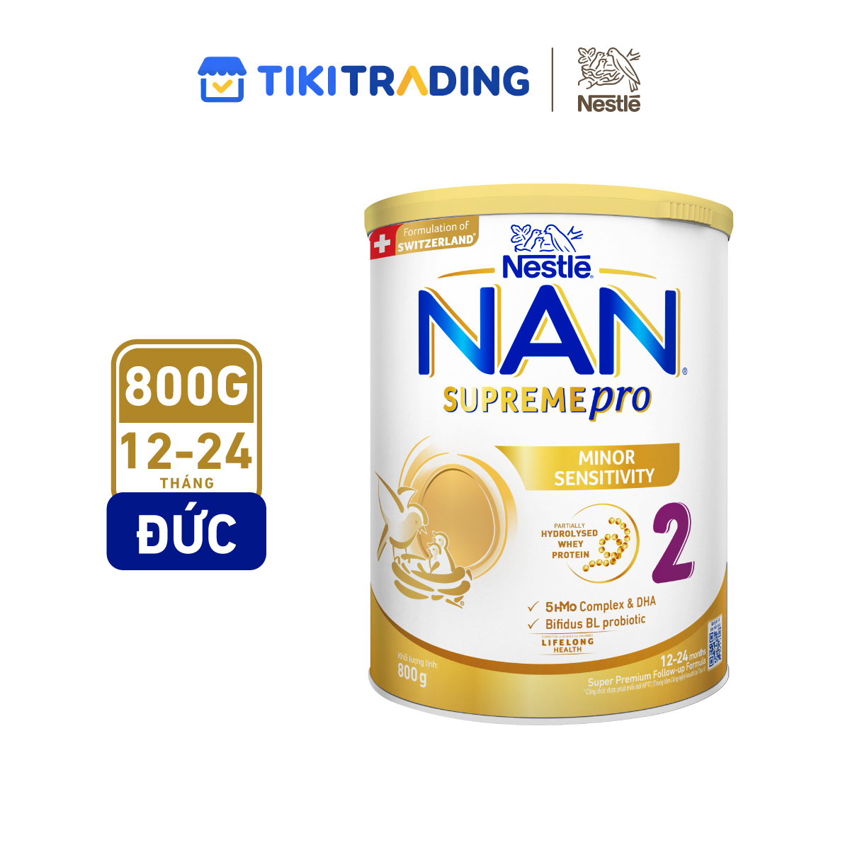 Sản phẩm dinh dưỡng công thức Nestlé NAN SUPREMEPRO 2 800g nhập khẩu trực tiếp từ Đức, phù hợp cho trẻ từ 12-24 tháng tuổi. Sữa có hệ dưỡng chất được nghiên cứu và hoàn thiện bằng khoa học, chứa đạm OPTIPRO thủy phân một phần giúp trẻ dễ tiêu hóa, hạn chế nguy cơ dị ứng hay mẫn cảm. Kết hợp cũng 5-HMO - dưỡng chất hỗ trợ tăng cường đề kháng tự nhiên, giúp bé giảm ốm vặt. Sữa Nestlé NAN SUPREMEPRO số 2 còn bổ sung lợi khuẩn BIFIDUS BL được nghiên cứu có tác dụng cân bằng hệ vi sinh đường ruột, hỗ trợ hoạt động tiêu hóa của trẻ diễn ra suôn sẻ.