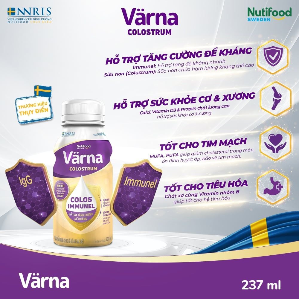 Värna Colostrum với Colos Immunel được phát triển và nghiên cứu bởi NNRIS (Viện Nghiên cứu Dinh Dưỡng Nutifoood Thụy Điển), và nguyên liệu Immunel độc quyền từ Sterling Technology USA. Immunel được chứng minh lâm sàng hỗ trợ tăng cường sức đề kháng nhanh. Värna Colostrum bổ sung hệ dưỡng chất kép từ sữa non và Immunel (phân đoạn sữa non phân tử lượng thấp.