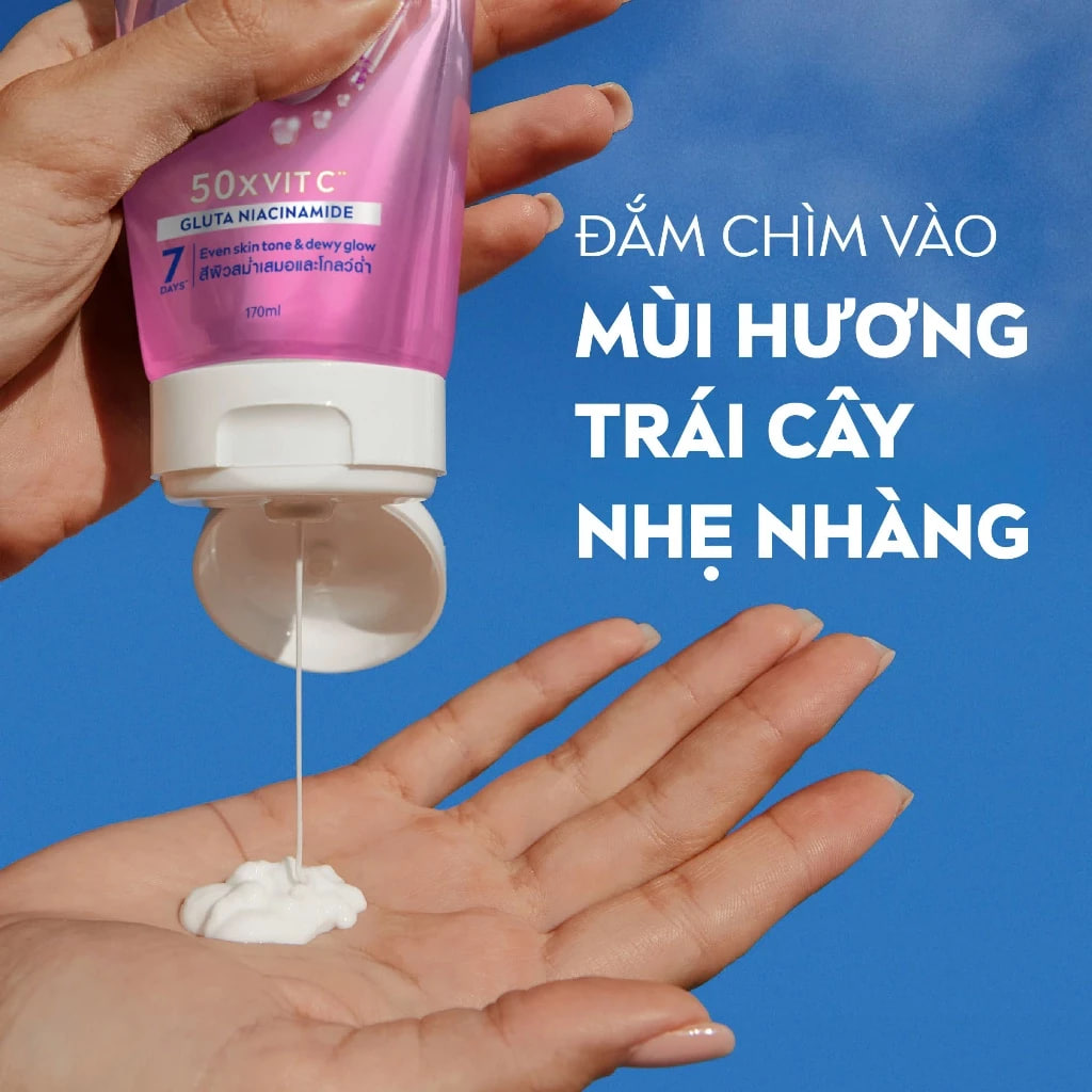 Công thức được tăng cường hàm lượng Vitamin C cô đặc (50x Vitamin C** & Vitamin A) không chỉ giúp phục hồi làn da sạm đen và hư tổn mà còn dưỡng da trắng mịn, làm mờ vết thâm sạm trong 7 ngày*.
