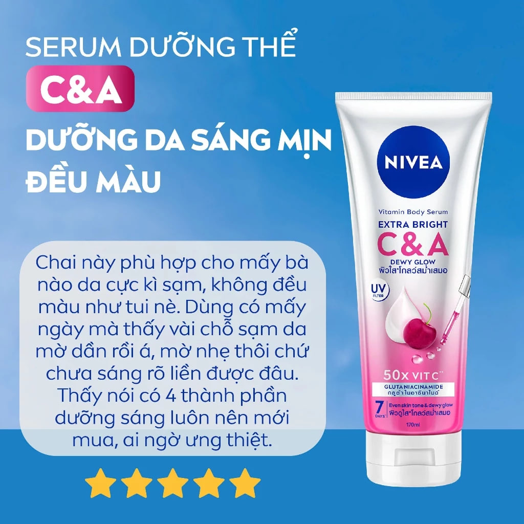 Dưỡng trắng hiệu quả và an toàn. Mình thích dưỡng thể của Nivea hơn các hãng khác là do tính thấm nhanh và ko gây kích ứng.