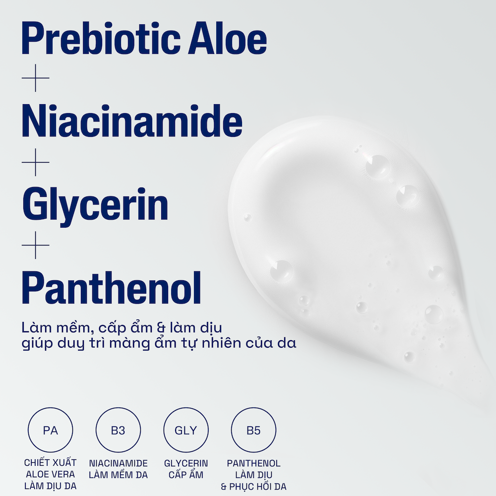 • Với sự kết hợp 3 hoạt chất lành tính Niacinamide (Vitamin B3), Panthenol (Pro-vitamin B5) và Glycerin giúp kích thích da sản sinh 15 Ceramides tự nhiên giúp cải thiện khả năng phục hồi của làn da nhạy cảm.