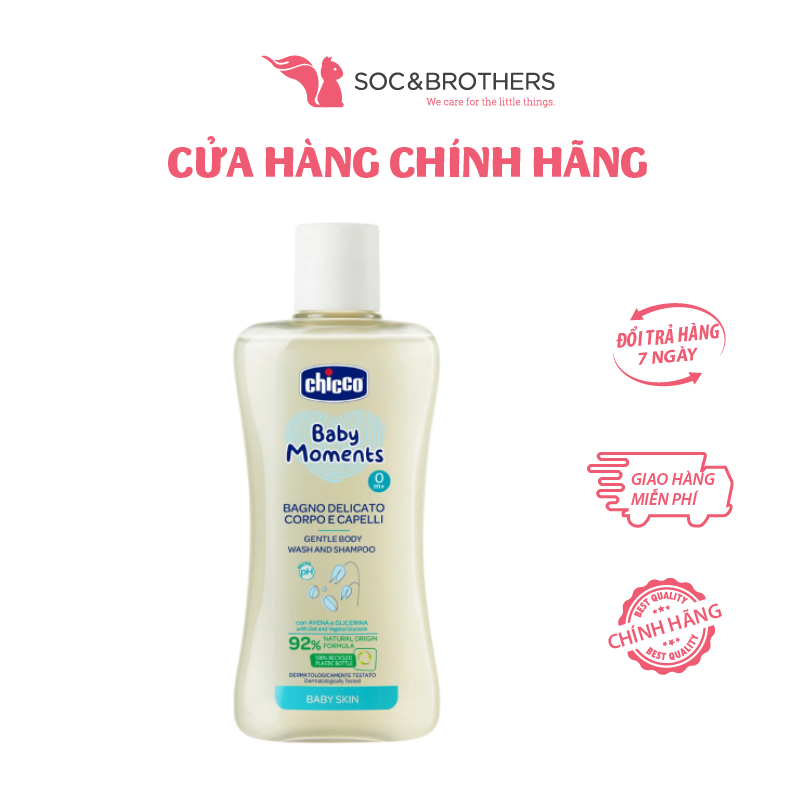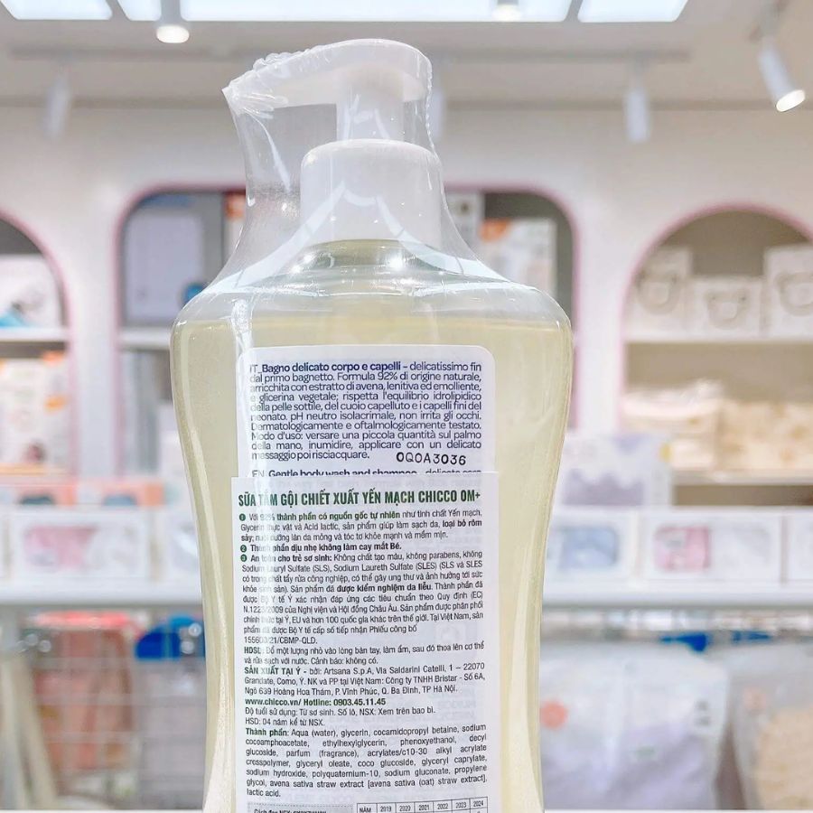 Sữa tắm gội Chicco có thành phần chiết xuất tự nhiên từ Yến Mạch: bổ sung vitamin B, acid amin giúp làm mềm tóc và giữ ẩm cho da;