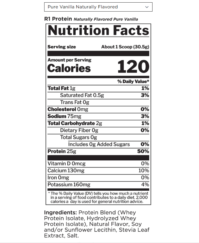 - NÊN DÙNG BAO NHIÊU R1 PROTEIN NATURALLY FLAVORED? Nó thực sự phụ thuộc vào các yếu tố như cân nặng, chế độ ăn uống của bạn bao gồm những gì, tổng số calo bạn tiêu thụ và mức độ hoạt động của bạn. Một nguyên tắc chung trong thế giới thể hình là nhắm tới 1 gram protein cho mỗi pound trọng lượng cơ thể/mỗi ngày. Nói cách khác, một vận động viên 200 lb nên nhắm mục tiêu 200 g tổng protein từ tất cả các nguồn thực phẩm bao gồm bột protein và các chất bổ sung khác.