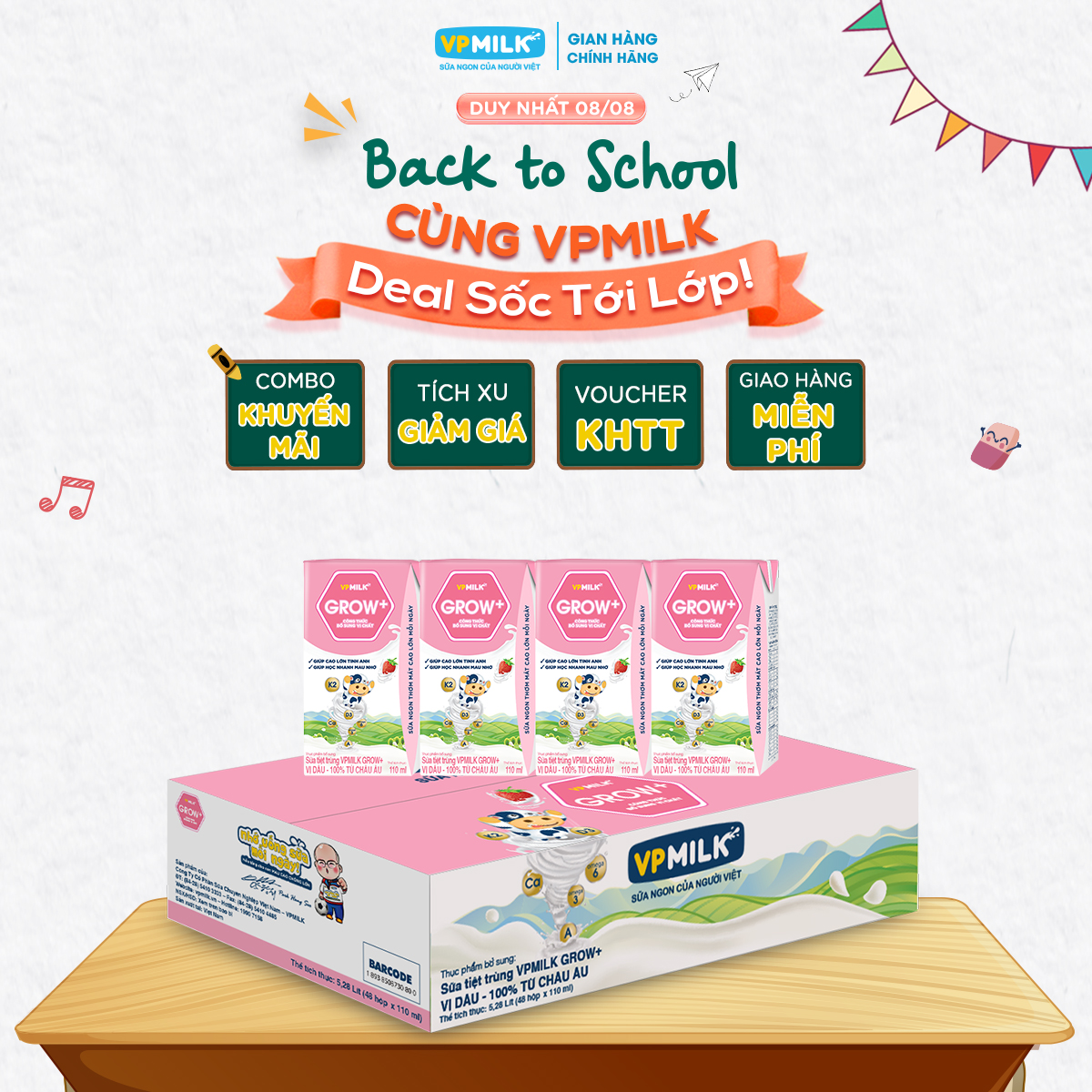 Sữa Tiệt Trùng VPMilk Grow+ là loại sữa phù hợp cho trẻ từ 1 tuổi trở lên. Sản phẩm được nghiên cứu theo thể trạng của trẻ em Việt Nam sẽ đồng hành cùng mẹ nhằm đem đến nền tảng khoẻ mạnh tự nhiên cho bé yêu. Với Sữa Tiệt Trùng VPMilk Grow+ giờ đây mẹ đã có thể yên tâm và tự tin rằng đã có một giải pháp hoàn hảo để con yêu có thể phát triển cao lớn vượt trội, giúp con thêm tự tin, vững bước thành công trong tương lai.