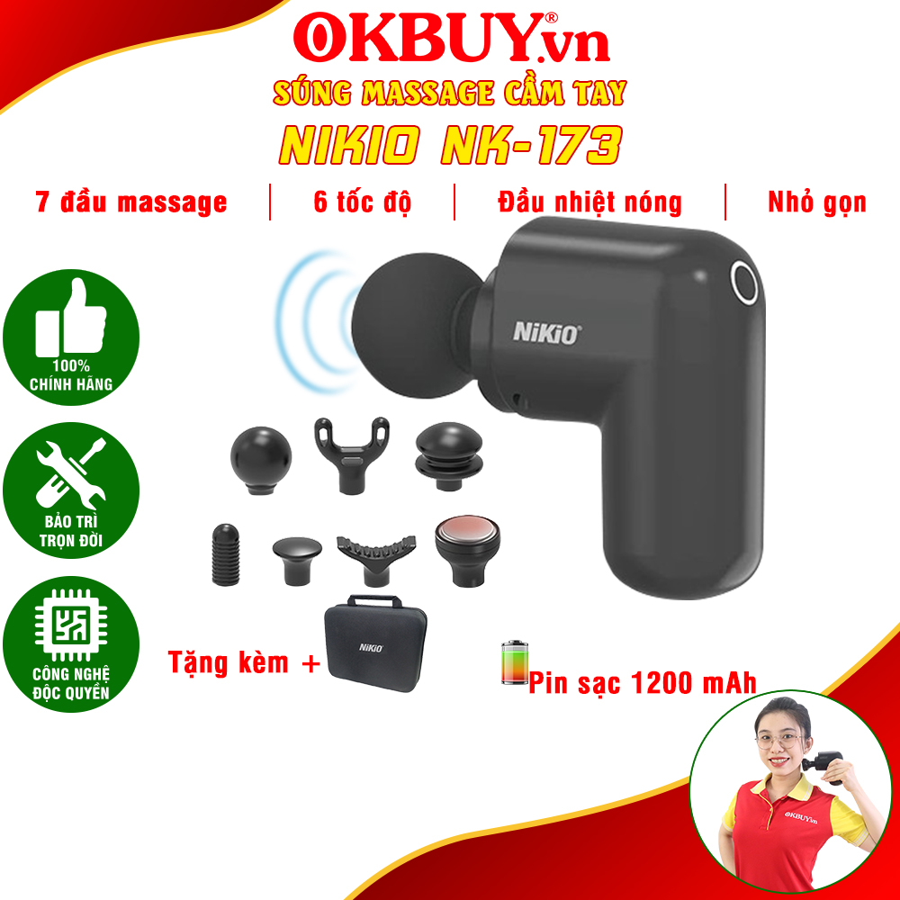 Súng massage cầm tay mini Nikio NK-173 - 7 đầu. Hàng siêu nhỏ nhưng lực đấm mạnh mẽ, công nghệ đầu nóng giúp giảm nhanh các cơn đau nhức, căng cơ. Không dây pin sạc, phù hợp cho chị em, người lớn tuổi sử dụng