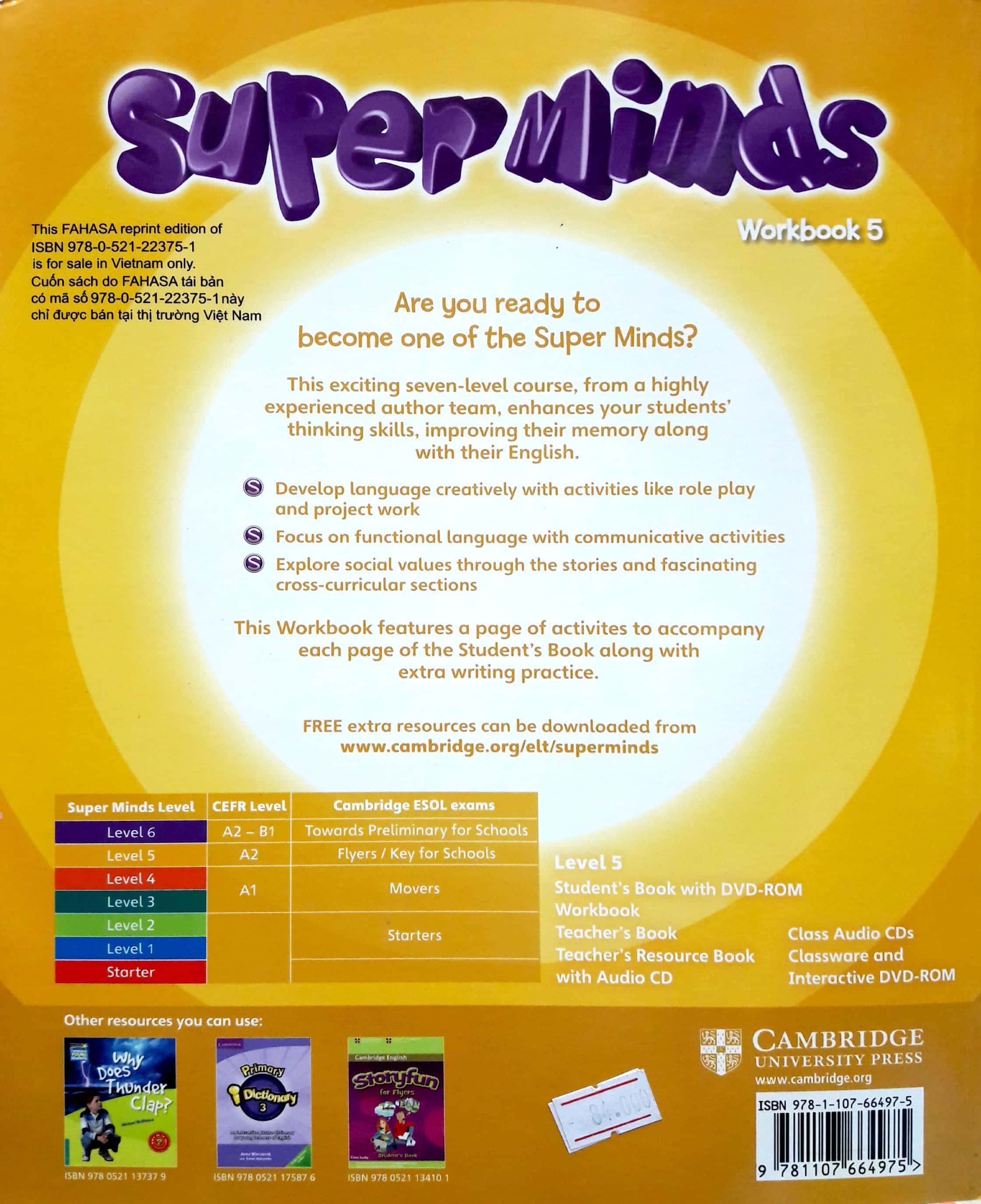 Super Minds American English is a seven-level course for young learners. Written by a highly experienced author team, Super Minds enhances your students' thinking skills, improving their memory along with their language skills. This Level 5 Workbook includes activities to develop language creatively, fascinating cross-curricular sections, and lively stories that explore social values. For each Student's Book page, this Workbook features a page of activities. Class Audio CDs, including audio from the Student's Book and Workbook, are sold separately.Giá sản phẩm trên Tiki đã bao gồm thuế theo luật hiện hành. Bên cạnh đó, tuỳ vào loại sản phẩm, hình thức và địa chỉ giao hàng mà có thể phát sinh thêm chi phí khác như phí vận chuyển, phụ phí hàng cồng kềnh, thuế nhập khẩu (đối với đơn hàng giao từ nước ngoài có giá trị trên 1 triệu đồng).....